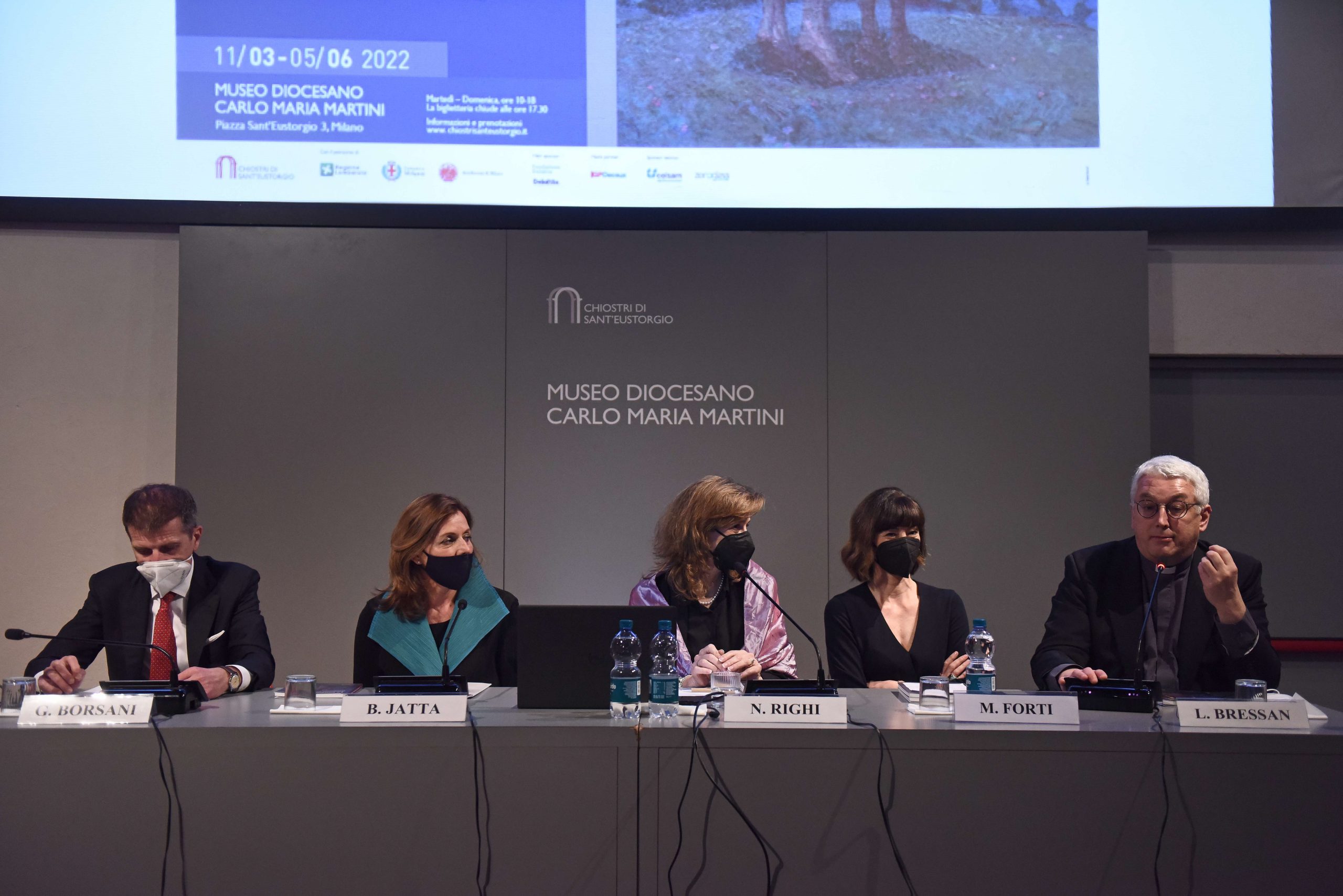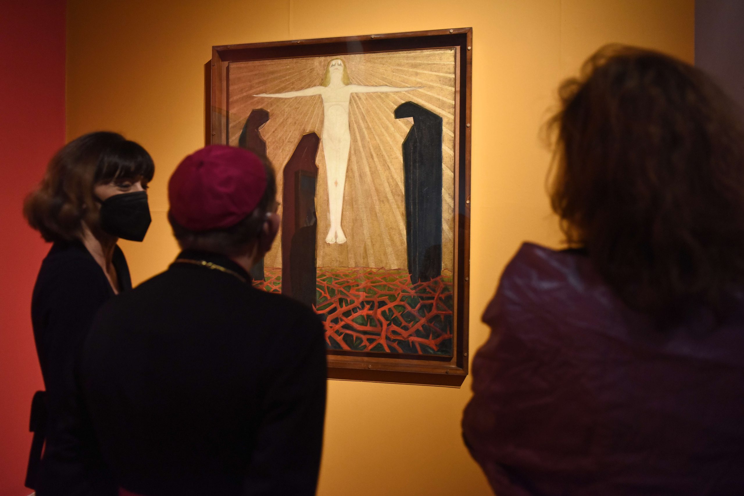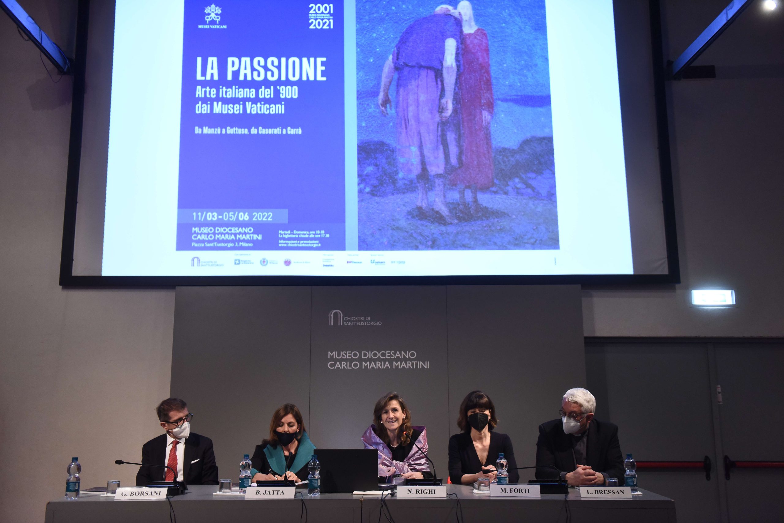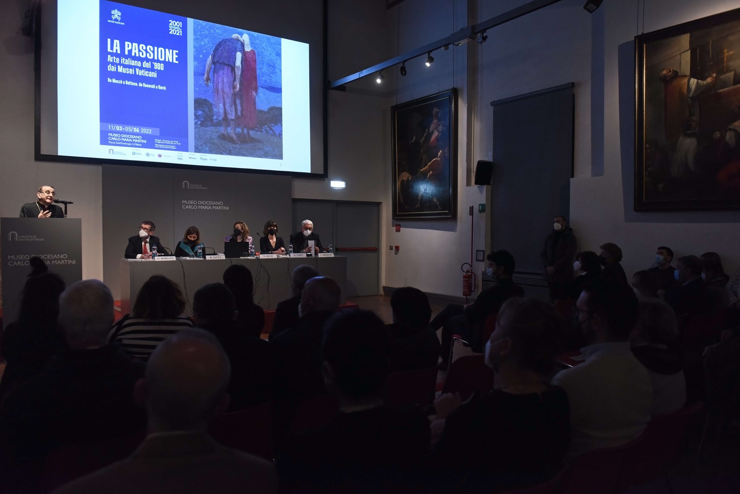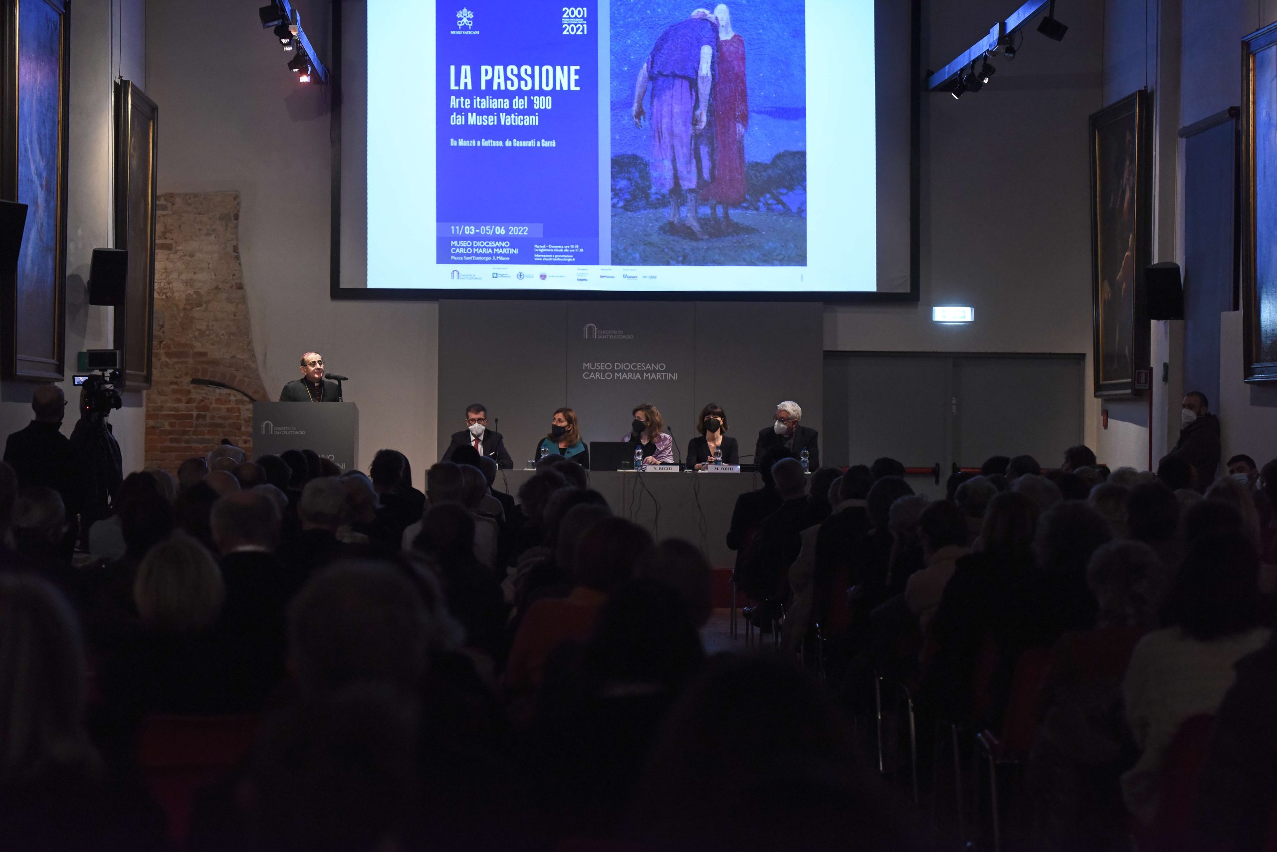 Il percorso espositivo – insieme altamente evocativo e concretamente temporale, centrato sullo svolgersi degli eventi dal tradimento di Giuda alla crocifissione, per arrivare alla risurrezione – accompagna il visitatore a riflettere sul Mistero cristiano, ma anche sulla vicenda umana di ogni tempo. Storia fatta di dolore e di speranza, compassione e dolcezza, buio della morte e luce di una risurrezione che può avvenire ogni giorno. Così in questi giorni il pensiero va subito alla guerra in corso, con il suo carico di lutto e di interrogativi, come osserva l’Arcivescovo inaugurando la rassegna. Accanto a lui, tra gli altri, la curatrice Micol Forti (responsabile della Collezione d’Arte moderna e contemporanea dei Musei vaticani), la direttrice degli stessi Musei Barbara Jatta, Nadia Righi (direttrice del Museo diocesano), il presidente della Fondazione Sant’Ambrogio per la Cultura Cristiana, il diacono Ugo Pavanello, e il vicario episcopale di settore, monsignor Luca Bressan.