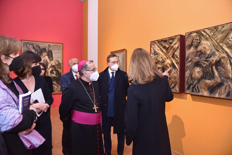 Riferendosi all’ideazione dell’esposizione, pensata in tempo di Covid, l’Arcivescovo ha continuato: «Adesso si inaugura la mostra in un tempo in cui la morte non viene da un virus misterioso, ma dalla volontà di persone, di donne e uomini, di un apparato che vuole vincere a costo della vita degli altri. Il senso di tragedia e di dolore si è trasformato in modo drammatico». Da qui un’ulteriore domanda. «Gli artisti sanno certamente raccontare il dolore con una modalità espressiva specifica, ma sanno anche raccontare la speranza? Il ‘900, forse, è diventato come afono, smarrito di fronte alla speranza: sa bene dire della morte, ma della risurrezione, della speranza e che la vita vada verso un esito capace di trasfigurare il dolore e la storia, sa parlare? Mi pare che su questa strada molti artisti del ‘900 vedano un’impossibilità a proseguire. Questa mostra ha, come ultima opera del percorso, il bozzetto della Resurrezione di Pericle Fazzini, che non è un lieto fine, ma un dramma che si trasfigura e che porta in sé il dramma di tutte le storie, ma anche la speranza. Io vorrei augurare a tutti coloro che la visiteranno e che ne parleranno, di comunicare che questo museo, che le persone che lo curano, che a Milano sanno come si scrive il dolore, ma anche come si scrive la speranza».