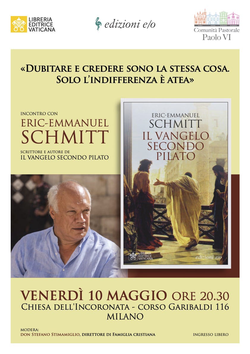Venerdì 10 maggio, alle 20.30, Eric-Emmanuel Schmitt, tra i più celebri scrittori di lingua francese, racconta il suo romanzo Il Vangelo secondo Pilato (edizioni e/o-Libreria Editrice Vaticana) nella chiesa di Santa Maria dell’Incoronata (corso Garibaldi 116) a Milano, su iniziativa di don Paolo Alliata, ideatore delle «Passeggiate Letterarie». A introdurre e guidare il dialogo don Stefano Stimamiglio, direttore di Famiglia cristiana. L’ingresso è libero (vedi qui la locandina).