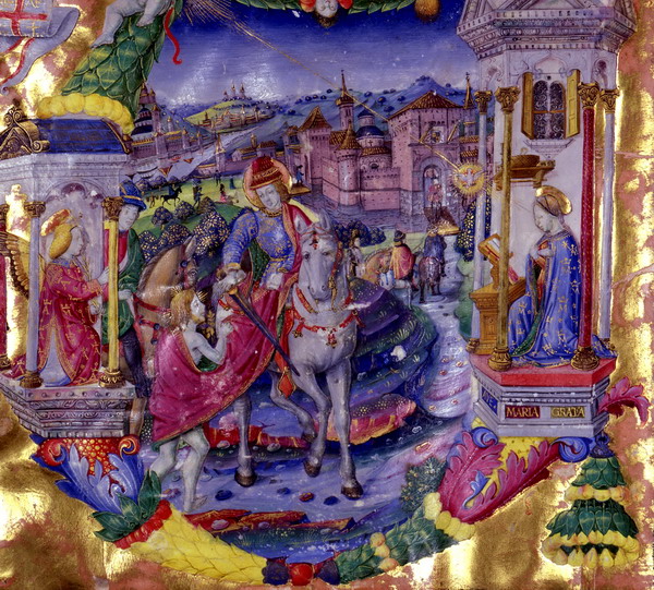 Poco oltre, la storia della salvezza ha inizio con l’Annuncio alla Vergine, nella mirabile miniatura di un grande antifonario ambrosiano, donato alle romite di Santa Maria del Monte nel 1476 da quel Fabrizio Marliani che fu membro influente della corte sforzesca, raffinato bibliofilo e futuro vescovo di Piacenza. Maria è in ginocchio, le braccia incrociate sul petto, nel tipico gesto della humiliatione, cioè di colei che umilmente sta pronunciando il suo «sì» al volere di Dio, mentre la colomba dello Spirito Santo scende su di lei. Cristoforo de’ Predis è l’autore di tanta bellezza, cui l’essere sordomuto non impedì di diventare uno dei più acclamati artisti del suo tempo, amico e collaboratore di Leonardo da Vinci.