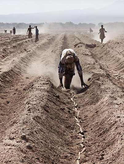 Il fotografo ha deciso di accompagnare le sue immagini – solo apparentemente “tranquille” – con una serie di precise informazioni che ci permettono di cogliere tutta la gravità del fenomeno in corso. Ed ecco allora che quelle stesse immagini vengono ad acquisire una drammaticità, un’intensità che a prima vista non avremmo attribuito loro. Leggendo e insieme guardando, ci rendiamo conto infatti che dietro situazioni agresti fintamente “idilliache” si cela invece l’esproprio della terra nei confronti di comunità indifese, in quanto prive dei necessari documenti scritti per attestare il possesso della terra (per molte popolazioni era infatti il diritto consuetudinario a fare legge); si apre la strada a un utilizzo privato dell’acqua che penalizza pesantemente le popolazioni locali; si disgrega l’agricoltura tradizionale, basata sulla diversificazione, per favorire una monocultura pensata solo per l’esportazione.