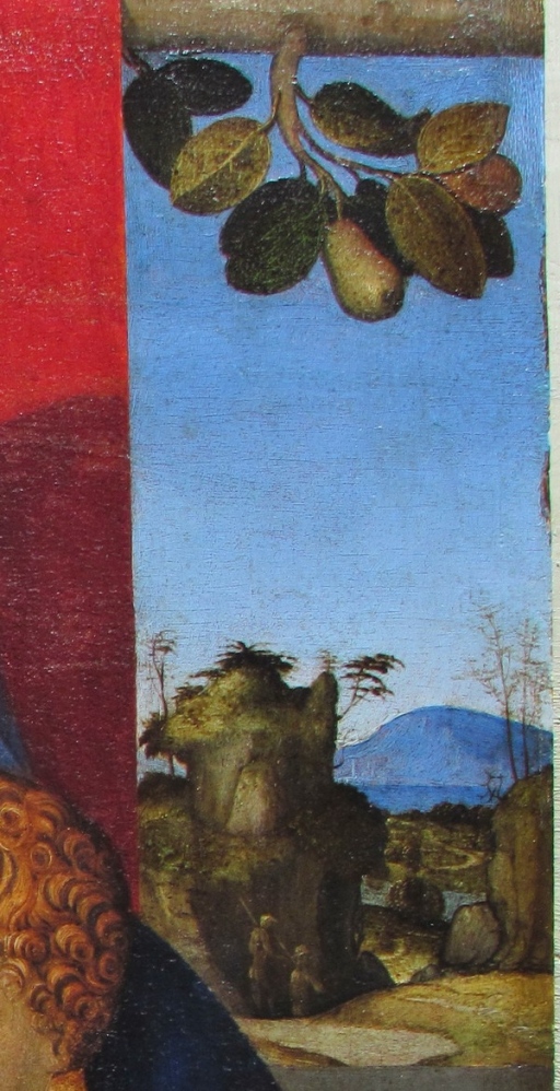 Sul fondo, da entrambi i lati, si aprono due profondi scorci paesaggistici, illuminati da un nitido cielo azzurro. La strada che si snoda sulla destra, in particolare, può forse evocare il viaggio compiuto dalla Sacra Famiglia per scampare alla follia omicida di Erode. Se così fosse, ci troveremmo di fronte a un’insolita interpretazione del diffuso tema del “riposo” durante la fuga in Egitto.
