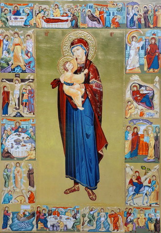 L’icona dipinta nell’estate del 2013 dal maetro Iulian Rosu ha un tema mariano coerente con il titolo della chiesa (Beata Vergine della Consolazione) e con il settecentesco affresco mariano, ma con una situazione, come rovesciata.