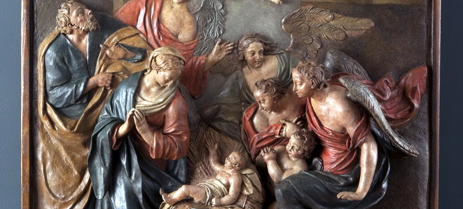 L’altorilievo, inedito, è ancora in fase di studio, ma un attento restauro ha già rivelato tutta la brillantezza della policromia originaria, oltre a dettagli plastici prima perfino insospettabili. Si tratta di un’opera destinata alla devozione privata, forse domestica (nonostante le dimensioni non siano modeste, misurando circa un metro di base), e presenta caratteri tipici di una cultura per così dire “popolare”, basata, cioè, sulla ricerca di una vivace espressività, di un acceso dinamismo, di un coinvolgimento emotivo dello spettatore. Come a voler rendere partecipe chi guarda, insomma, di quell’evento lieto e straordinario della venuta al mondo del Salvatore, il Dio fattosi uomo per amore.