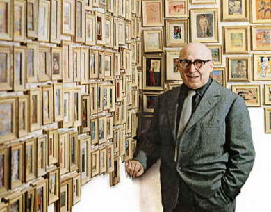 Ma Zavattini, lo si sa, aveva del genio. E là dove mancavano i mezzi, riuscì a supplire con la fantasia. Come? Commissionando dei quadri “in miniatura” agli artisti del suo tempo che più lo ispiravano, fissandone le dimensioni in 8 per 10 centimetri (poco più di un pacchetto di sigarette), ma per il resto lasciando gli autori liberi di scegliere tecnica e soggetto. La raccolta ebbe inizio per di più in tempo di guerra, nel 1941, ma andò rapidamente arricchendosi, tanto da ricoprire in pochi anni le pareti della casa romana dello scrittore come una “tappezzeria” multicolore (o come accade con gli ex voto, nelle cappelle di venerati santuari…). Una vera e propria enciclopedia della pittura italiana del Novecento, formata da minuscoli paesaggi, nature mostre, soggetti astratti, ritratti. E che arrivò a contare quasi 1500 pezzi, prima di essere venduta e dispersa dallo stesso Zavattini, negli ultimi anni di vita, sempre per necessità economiche.