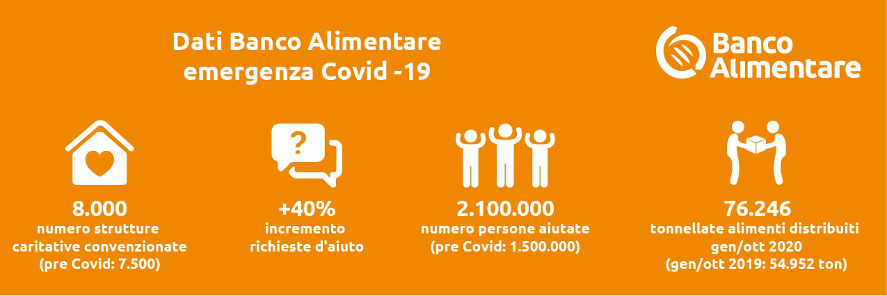 «Il bisogno alimentare cresce di pari passo con il crescere della crisi sanitaria che, ogni giorno di più, si manifesta come crisi sociale ed economica – afferma Giovanni Bruno, presidente della Fondazione Banco Alimentare Onlus -. Banco Alimentare ha reagito in questi mesi cercando di incrementare lo sforzo organizzativo messo in campo. Purtroppo col passare del tempo cresce anche il timore, lo smarrimento e per molti il rischio di rinchiudersi in se stessi. “Da una crisi si esce o migliori o peggiori, dobbiamo scegliere – ci ha ricordato Papa Francesco -. E la solidarietà è una strada per uscire dalla crisi migliori”. Per questo proponiamo a tutti, anche quest’anno, in una situazione via via sempre più incerta, la possibilità di “scegliere”: scegliere per un gesto di solidarietà. Chiediamo perciò a tutti, la testimonianza che un gesto semplicissimo di carità, può contribuire a non far vincere l’individualismo, preoccupazione espressa recentemente anche dal Presidente Mattarella: “Riemerge il virus dell’egoismo, dei singoli e degli Stati, ed è pericoloso quanto gli effetti del Coronavirus”».