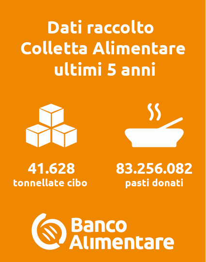 Negli ultimi 5 anni, con la Giornata Nazionale della Colletta Alimentare, sono state raccolte 41.628 tonnellate di cibo equivalenti a 83.256.082 pasti per persone bisognose.
