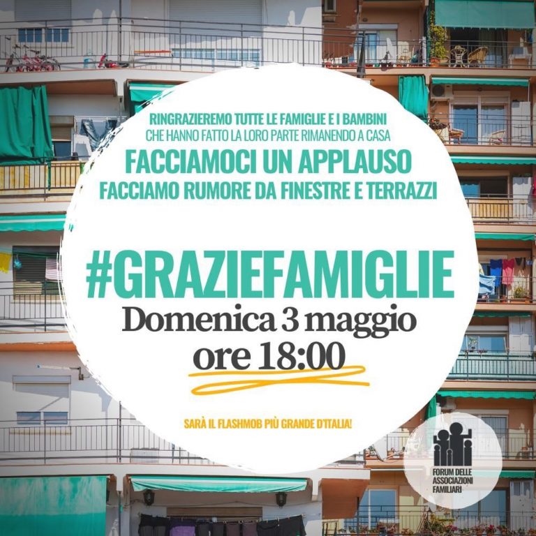 Affacciati ad applaudire e ringraziare, ciascuno a suo modo e con il proprio stile: genitori, bambini e nonni che non uscendo di casa hanno dato un contributo decisivo al bene comune. È il flash-mob nazionale #graziefamiglie, lanciato dal Forum delle associazioni familiari, in programma domenica 3 maggio, alle ore 18. «Certamente – si legge in una nota – non una festa o un segnale per dire che è finito tutto, viste le drammatiche circostanze che stiamo ancora continuando a vivere, ma un’occasione per ribadire che continua l’impegno per le famiglie nel fare da ammortizzatore sociale, vivendo in spazi stretti per mesi, evitando tensioni sociali, rinunciando a vedere i parenti più stretti. Un modo non convenzionale per tributare un riconoscimento alle famiglie del Paese per quanto hanno saputo organizzare, sacrificare, superare, sopportare finora in questi oltre due mesi di lockdown obbligatorio. Un’occasione, per i nuclei familiari italiani, per “dirsi” grazie e lanciare nel contempo un segnale al Paese: nella Fase 2 bambini, mamme, papà, nonni meritano a pieno titolo di essere protagonisti della narrazione e delle misure economiche e sociali».
