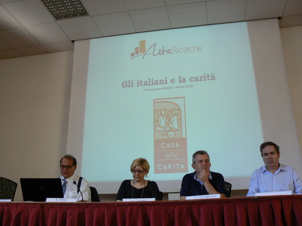 Partendo da un confronto con la precedente inchiesta, effettuata nel 2005, Finzi ha esposto e analizzato i nuovi dati raccolti. L’indagine è stata effettuata su un campione di persone tra i 15 e i 69 anni, allo scopo di capire come si relazionano gli italiani con la carità e quale significato essi le attribuiscano. Nonostante la crisi economica, l’Italia rappresentata da questa ricerca si conferma nel complesso generosa, altruista e solidale. Tuttavia, con la recessione, rispetto al 2005, diminuisce la percentuale di quanti partecipano attivamente, mentre si registra un incremento di indifferenza nei confronti delle tematiche legate alla carità.