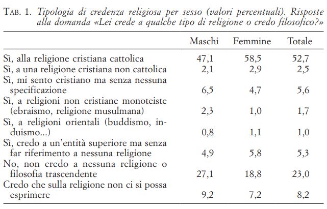 Un altro aspetto che emerge dall’indagine è il modo con cui i giovani si pongono di fronte all’esperienza religiosa e alla trascendenza, che sta subendo profonde trasformazioni. Viene rivelata, infatti, una sensibilità religiosa non spenta, ma attutita. Si è di fronte a un «fai da te» in cui prevale la ricerca di benessere e armonia interiore. L’oggettività di un’esperienza religiosa, che fa i conti con regole, gerarchie e riti viene rifiutata. Alla domanda «Lei crede a qualche tipo di religione o credo filosofico?», le risposte si raccolgono attorno a due opzioni: quella della religione cattolica (52,7%) e quella di chi dichiara di non credere a nessuna religione (23%) (tabella allegata). Anche la frequenza ai riti conferma la distanza dei giovani dall’esperienza religiosa: coloro che dichiarano di frequentare la Chiesa una volta a settimana sono l’11,7%. Il 53,8% è costituito da frequentatori occasionali: il 20,2% partecipa a una funzione religiosa qualche volta l’anno oppure in particolari circostanze. Il 25,1% non partecipa mai.