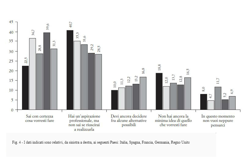 Il Rapporto mette anche a confronto i giovani italiani e i coetanei europei nel quadro delle aspirazioni professionali e come ritengano di poterle realizzare (grafico allegato): sono i tedeschi (39,6%) e gli spagnoli (36,7%) a esprimere maggiori certezze su ciò che intendono realizzare nel loro futuro professionale, mentre si dichiarano certi del loro destino il 31,3% dei britannici, il 28,8% dei francesi e meno di 1 italiano su 4 (22,5%). Viceversa, i nostri giovani spiccano (40,7%) insieme a spagnoli (35,3%) e francesi (33,6%) tra quelli che dichiarano di avere sì delle aspirazioni professionali definite, ma non sanno se riusciranno a realizzarle. La compagine degli «indecisi tra alternative possibili», decisamente più ridotta, vede al primo posto gli inglesi (16,8%). Più preoccupante è il caso dei giovani disorientati, quelli che non hanno alcuna idea rispetto a un possibile percorso professionale o che non ci vogliono nemmeno pensare, che rappresentano insieme una quota consistente degli intervistati italiani (26,8%), francesi (25,4%) e britannici (23,4%).