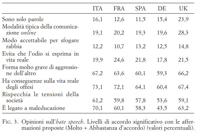 La “vita nella rete” è un altro grande tema indagato dal Rapporto (tabella allegata). I giovani sono sempre connessi, ma in maniera autonoma e attenta, e con una chiara tendenza a rifiutare ogni forma di violenza e di odio. In particolare, rispetto alle cause del fenomeno hate speech, gli intervistati ritengono che l’odio in rete sia collegato, in qualche modo, alle tensioni che circolano all’interno della società. Lo afferma, infatti, (somma delle modalità «Molto d’accordo» e «Abbastanza d’accordo») il 61,2%. Le percentuali di accordo significativo sul fatto che esprimere l’odio in rete possa essere considerata una forma socialmente accettabile in cui incanalare l’espressione dell’odio e del risentimento sono molto basse (12,2%). Le percentuali si alzano lievemente quando si tratta di prendere posizione sul fatto che esprimere online atteggiamenti negativi verso l’altro possa in un certo senso sublimare la violenza sottraendola alla vita reale. Sono infatti d’accordo con questa affermazione il 19,9% dei giovani italiani. Questo non significa, però, che l’hate speech sarebbe, alla fine, «solo parole», quindi un fenomeno di cui non preoccuparsi affatto. Che si tratti di mero flatus vocis lo pensa solamente il 16,1% dei giovani italiani