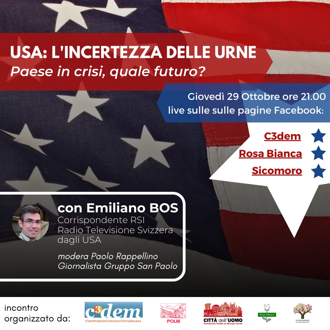«Usa: l’incertezza delle urne. Paese in crisi, quale futuro» è il tema del dibattito organizzato da C3Dem, Rosa Bianca, Sicomoro, Città dell’Uomo e Polis in diretta giovedì 29 ottobre, alle 21 sulle pagine Fb dei primi tre promotori.
