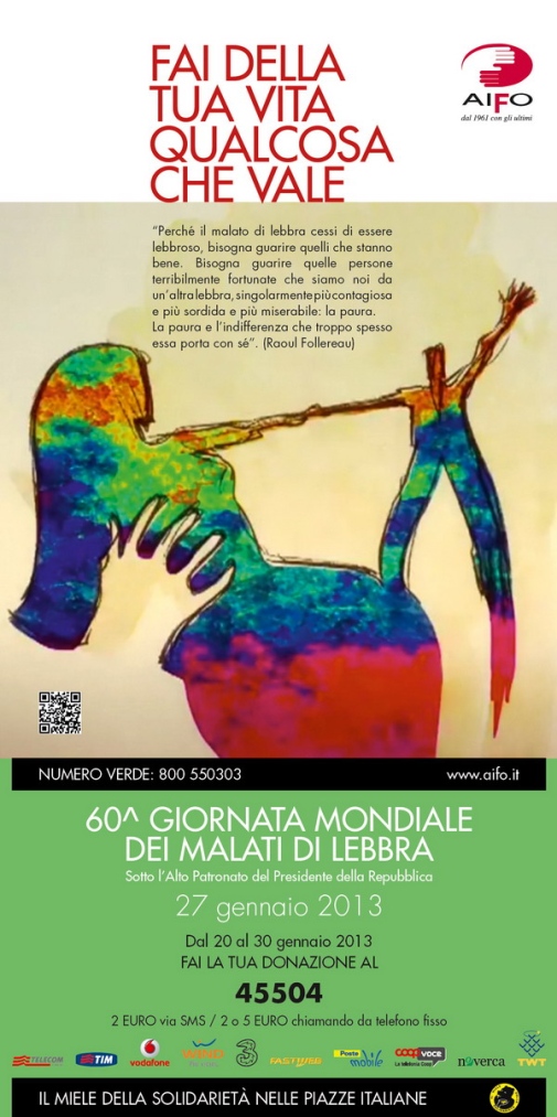 In collaborazione col Pontificio Istituto Missioni Estere, martedì 23 gennaio, dalle 18.30, presso l’Auditorium del Centro Pime (via Mosé Bianchi 94, Milano), l’Aifo organizza una mostra e un convegno per celebrare la 60a Giornata mondiale del malato di lebbra e consegnare il Premio 2013 “Fai della tua vita qualcosa che vale” alla memoria di Carlo Urbani, medico infettivologo che scoprì la Sars e, assistendone i malati, ne rimase purtroppo vittima (in allegato nel box in alto a sinistra l’invito).