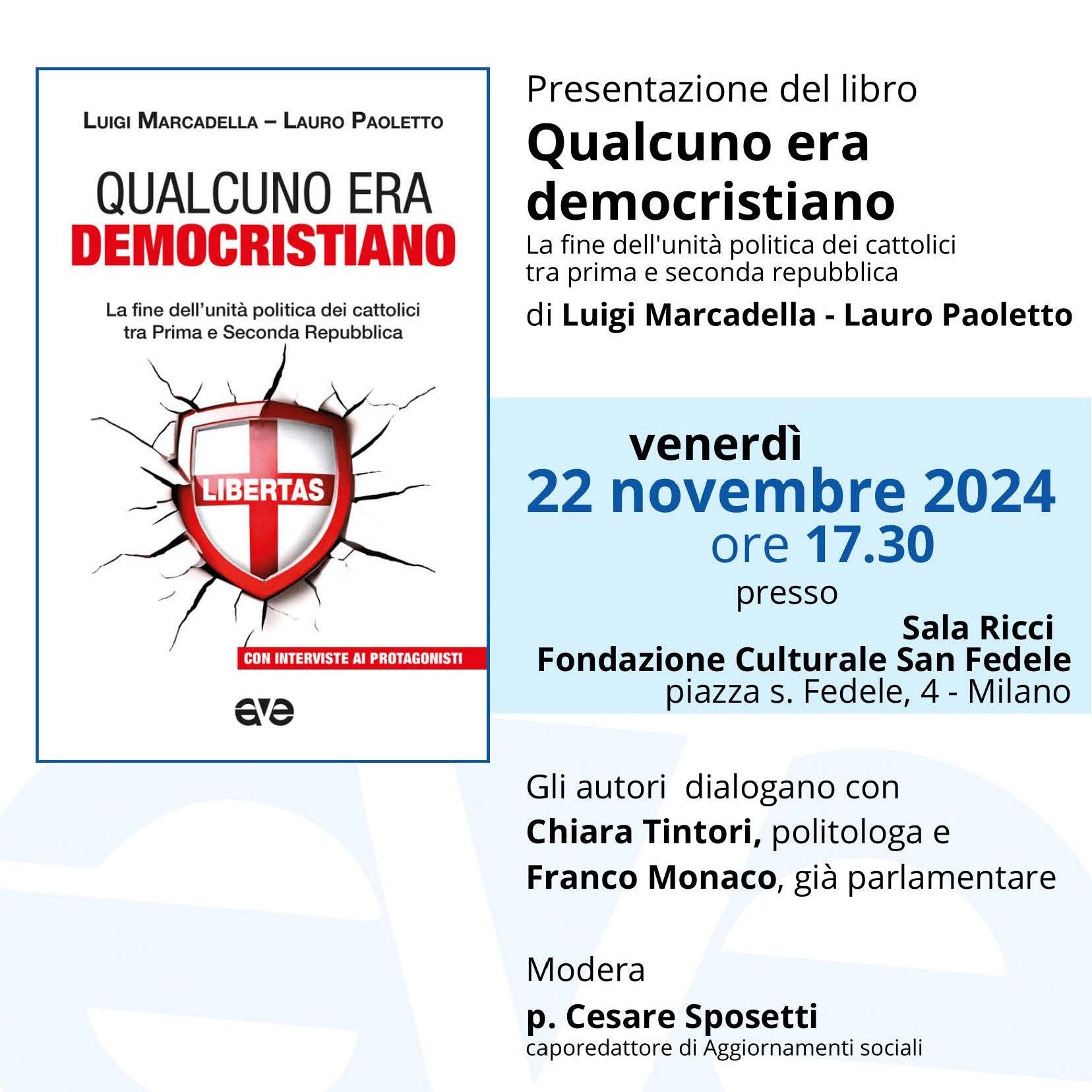 Dodici protagonisti della “Balena bianca”, a livello nazionale e regionale; altrettante interviste per raccontare i sei anni che hanno cambiato l’Italia, archiviato la Prima Repubblica e con essa i grandi partiti popolari. Tra il 1989 (ultimo congresso) e il 1994 (scioglimento del partito) si è conclusa anche la vicenda politica della Democrazia cristiana, il partito che per quasi 50 anni ha retto le sorti del Paese. I giornalisti Luigi Marcadella e Lauro Paoletto hanno raccontato i sei anni in cui la Dc «si è inabissata nel mare agitato della storia italiana, travolta dal crollo del Muro di Berlino, dagli scandali di Mani pulite, dalla questione morale e, soprattutto, dall’esaurirsi della spinta ideale che ne aveva ispirato l’azione nei decenni precedenti». Il libro, intitolato Qualcuno era democristiano. La fine dell’unità politica dei cattolici tra Prima e Seconda Repubblica, pubblicato da Ave, la casa editrice dell’Azione cattolica italiana, esce a trent’anni dalla fine della Democrazia cristiana (1994-2024).