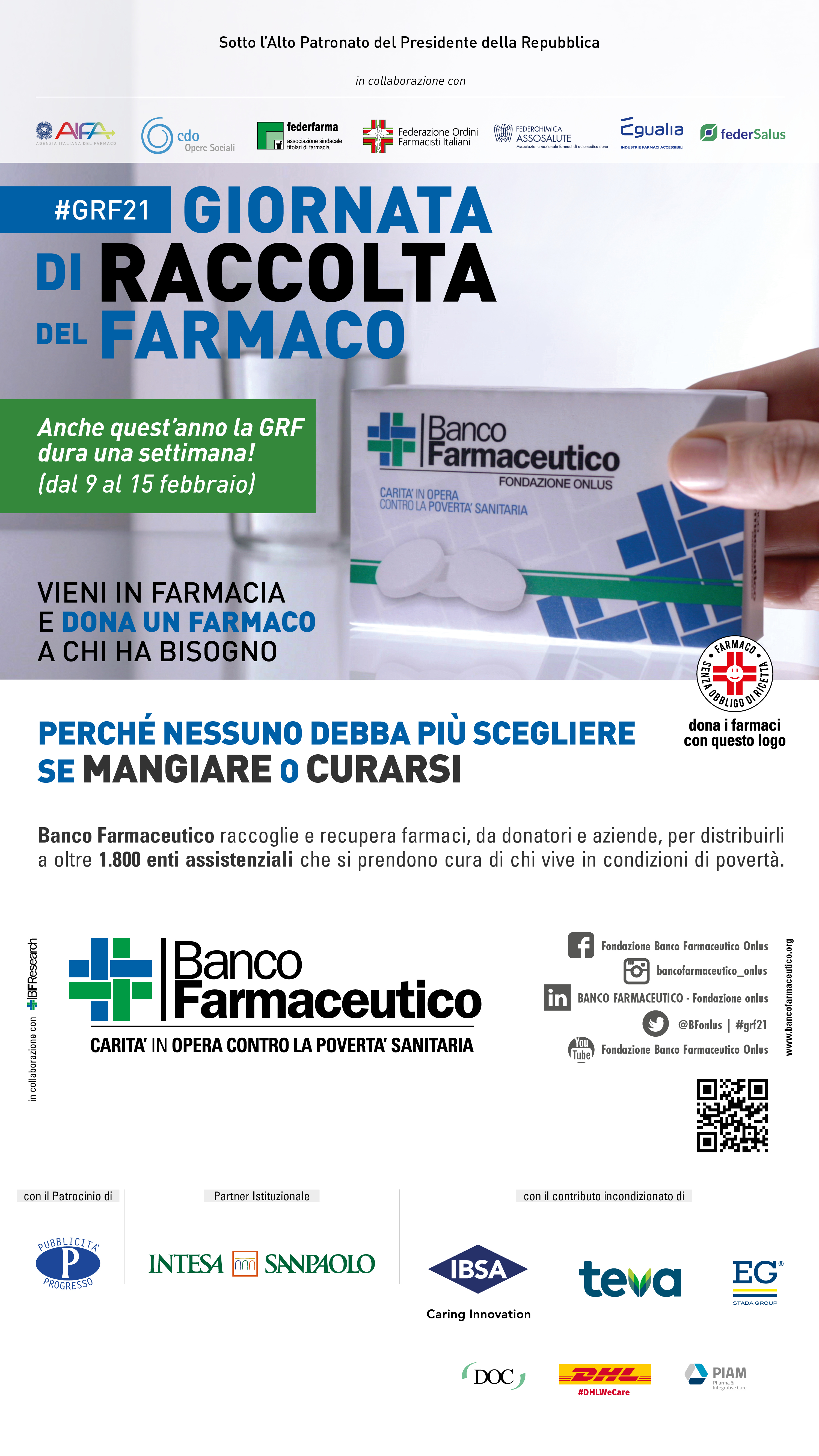 La GRF si svolge sotto l’Alto Patronato del Presidente della Repubblica, con il patrocinio di Aifa e in collaborazione con Cdo Opere Sociali, Federfarma, Fofi, Federchimica Assosalute, Egualia – Industrie Farmaci Accessibili, Federsalus e BFResearch. Intesa Sanpaolo è Partner Istituzionale dell’iniziativa. La GRF è realizzata grazie all’importante contributo incondizionato di IBSA, Teva ed EG Stada Group, e al sostegno di DOC Generici, Zentiva, DHL Supply Chain e Piam Farmaceutici. La Giornata è supportata da Responsabilità Sociale Rai, Mediafriends, La7, Sky per il sociale, e Pubblicità Progresso.