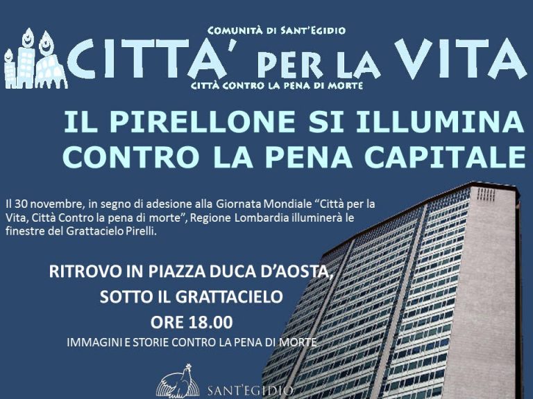 La Comunità di Sant’Egidio, che negli ultimi anni ha portato avanti una campagna in tutti i continenti per giungere a una moratoria universale, invita tutti a Milano il 30 novembre alle 18 sotto il Grattacielo Pirelli, che sarà illuminato in adesione a Cities for Life – Città per la Vita. Città contro la pena di morte. Seguirano immagini e storie contro la pena capitale.