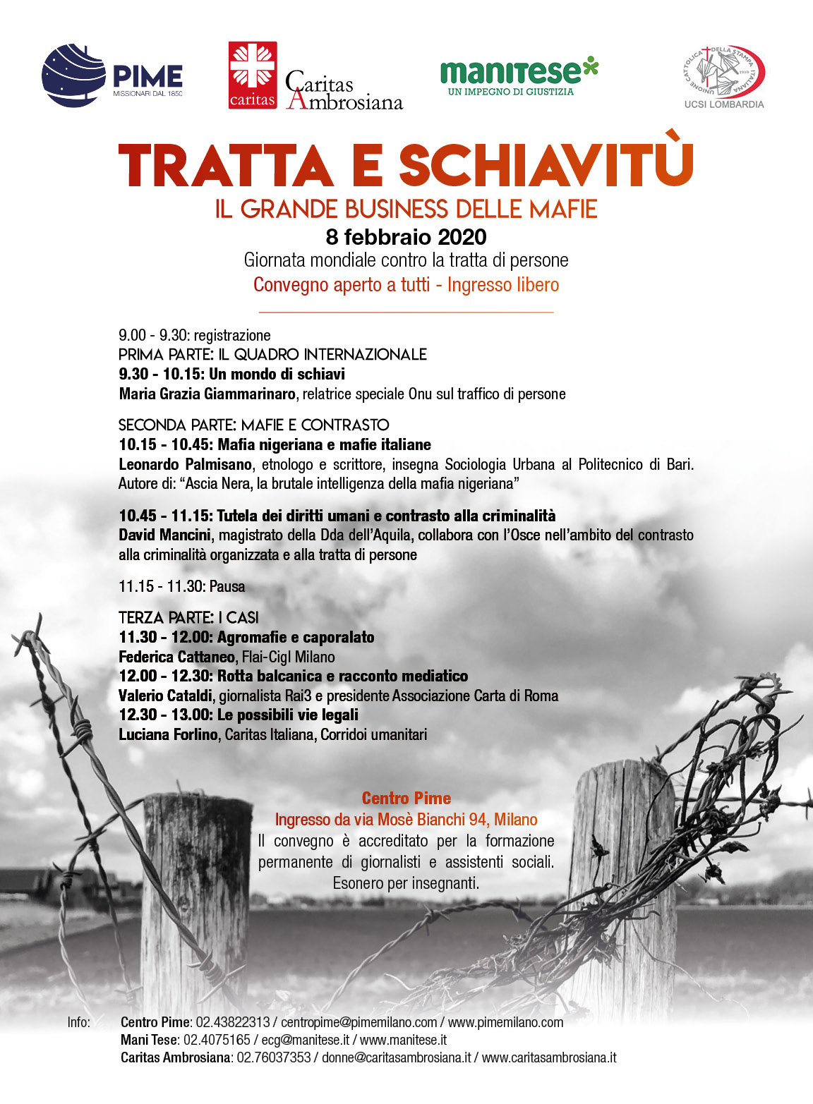 «Tratta e schiavitù: il grande business delle mafie. Come i gruppi criminali si arricchiscono con il traffico di persone. E come contrastarli e raccontarli» è il tema dell’appuntamento di sabato 8 febbraio al Centro Pime di Milano (via Mosè Bianchi 94), aperto a tutti con ingresso libero e accreditato per la formazione permanente di giornalisti e assistenti sociali, con esonero per gli insegnanti che vi parteciperanno (registrazione tra le 9 e le 9.30).
