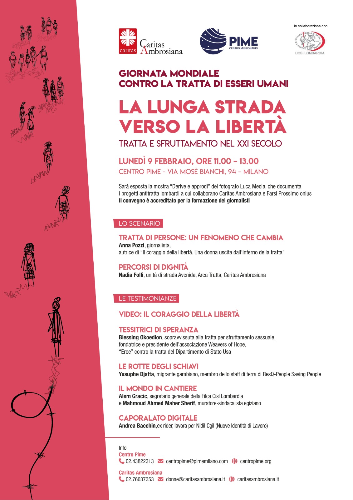 «La lunga strada verso la libertà, tratta e sfruttamento nel XXI secolo» è il tema del convegno promosso da Caritas ambrosiana e Centro Pime, in collaborazione con Ucsi Lombardia, in occasione della Giornata mondiale contro la tratta di esseri umani. Si svolgerà lunedì 9 febbraio, dalle 11 alle 13, presso il Centro Pime (sala Girardi), via Mosè Bianchi 94 a Milano. L’iniziativa è accreditata per la formazione dei giornalisti (vedi qui la locandina con il programma).