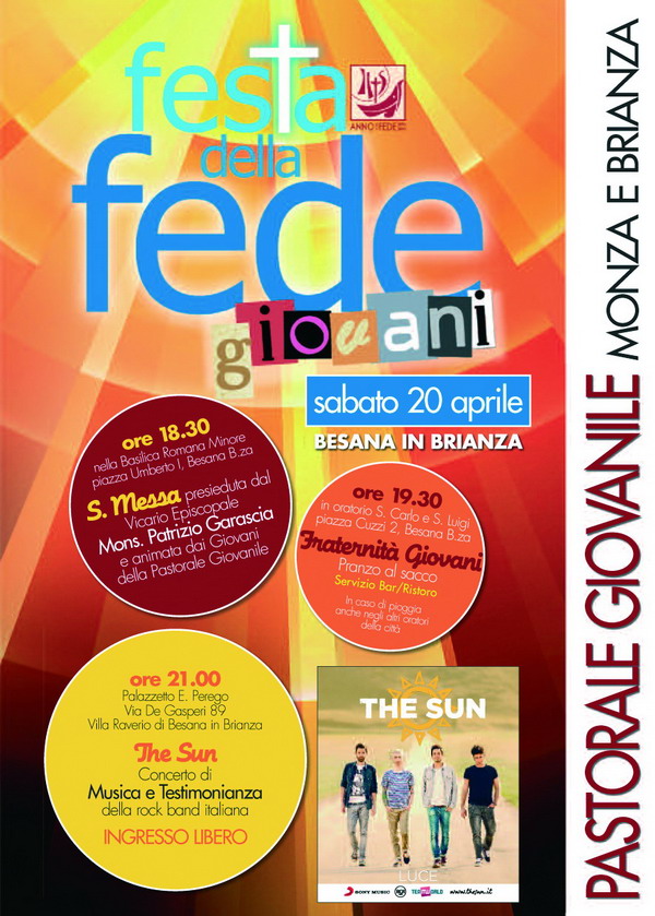 L’appuntamento con la “Festa della fede dei giovani” è per sabato 20 aprile a Besana Brianza. Il programma prevede alle 18.30 nella Basilica Romana Minore (piazza Umberto I) la Messa presieduta dal Vicario episcopale monsignor Patrizio Garascia e animata dai giovani della Pastorale giovanile. Alle 19.30 all’oratorio San Carlo e San Luigi (piazza Cuzzi 2), proprio dietro alla Basilica, “Fraternità giovani”, ossia la cena al sacco, anche se sarà attivo un servizio di ristoro. Nel caso di brutto tempo la cena verrà ospitata anche negli oratori di Villa Raverio e Montesiro. Alle 21 presso il palazzetto “E. Perego” (via De Gasperi 89), in località Villa Raverio di Besana Brianza l’atteso appuntamento con “The Sun in Concerto”, musica e testimonianza della rock band italiana con ingresso libero. Ai partecipanti sarà consegnato un pass gratuito che permetterà l’accesso anticipato al palazzetto; poi potranno entrate, nel limite della sicurezza e dei posti disponibili, anche tutti gli altri fans.