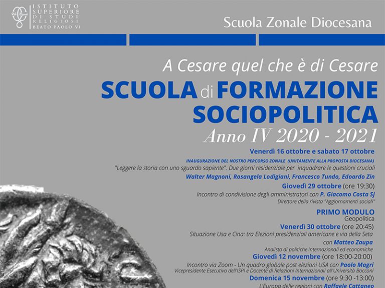 È in corso la quarta edizione della Scuola di Formazione Sociopolitica per i giovani della Zona di Varese (e non solo) «A Cesare quel che è di Cesare», promossa dall’Arcidiocesi di Milano. Il percorso si sviluppa in tre moduli (con la possibilità di iscriversi a parte del percorso stesso), che mettono a tema la situazione geopolitica mondiale, le sfide in tema economico e lavorativo post Covid e i rapporti tra famiglia, società ed economia. Un percorso ispirato alla fede cristiana e alla dottrina sociale della Chiesa, che prevede l’alternarsi di proposte di riflessione, di laboratorio e di confronto guidato tra i partecipanti. Obiettivo ulteriore è favorire l’interrelazione e la conoscenza reciproca tra i partecipanti, al fine di suscitare ulteriori cammini condivisi.