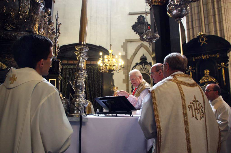 La quarta giornata del pellegrinaggio Ismi in Polonia ha avuto inizio con la Santa Messa, presieduta dal cardinale Angelo Scola nella cattedrale di Cracovia. In questa celebrazione, svoltasi davanti alla reliquia del sangue del Beato Giovanni Paolo II, si è pregato con particolare attenzione per la Chiesa universale. La predicazione è stata affidata a don Ivano Tagliabue, collaboratore della Formazione permanente del Clero. Nell’omelia, più volte don Ivano ha invitato a uno stile di franchezza, sull’esempio degli apostoli, all’interno delle comunità cristiane e tra i preti. «Il rigore di un annuncio fermo e la consegna di sé nell’andare incontro a ogni uomo nella complessità del mondo moderno e contemporaneo – ha ricordato don Ivano – è una delle caratteristiche che hanno segnato il pontificato di Giovanni Paolo II».