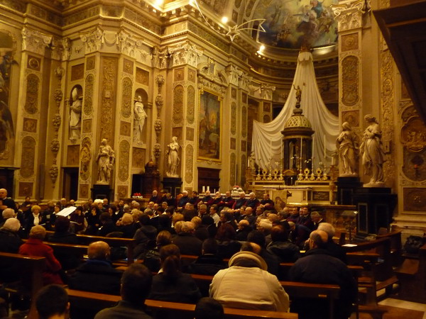 Per loro fino a qualche anno fa organizzavamo attività che completassero quelle del Centro sociale del Comune (un ambiente di ritrovo che è tuttora molto vivace). E così ogni settimana al martedì partivamo tutti insieme per quella che chiamavamo “la gita degli argentei”, dalle 13 alle 19.15. Andavamo a vedere mostre, visitavamo città e monumenti. Era un modo per tenere insieme le persone e creare tra loro un legame. Non si ha più tempo per tenere in piedi questa iniziativa. È rimasta, invece, la Messa alle 9 del giovedì, un appuntamento costante da ormai 23 anni, introdotto dal mio predecessore: qui la partecipazione è elevata, ci sono sempre 200-250 persone perché durante la celebrazione vengono ricordati anche diversi defunti. Al termine facciamo un breve momento di catechesi, in cui magari commentiamo qualche paragrafo degli scritti di Papa Francesco, documenti fondamentali che è bene che tutti conoscano.