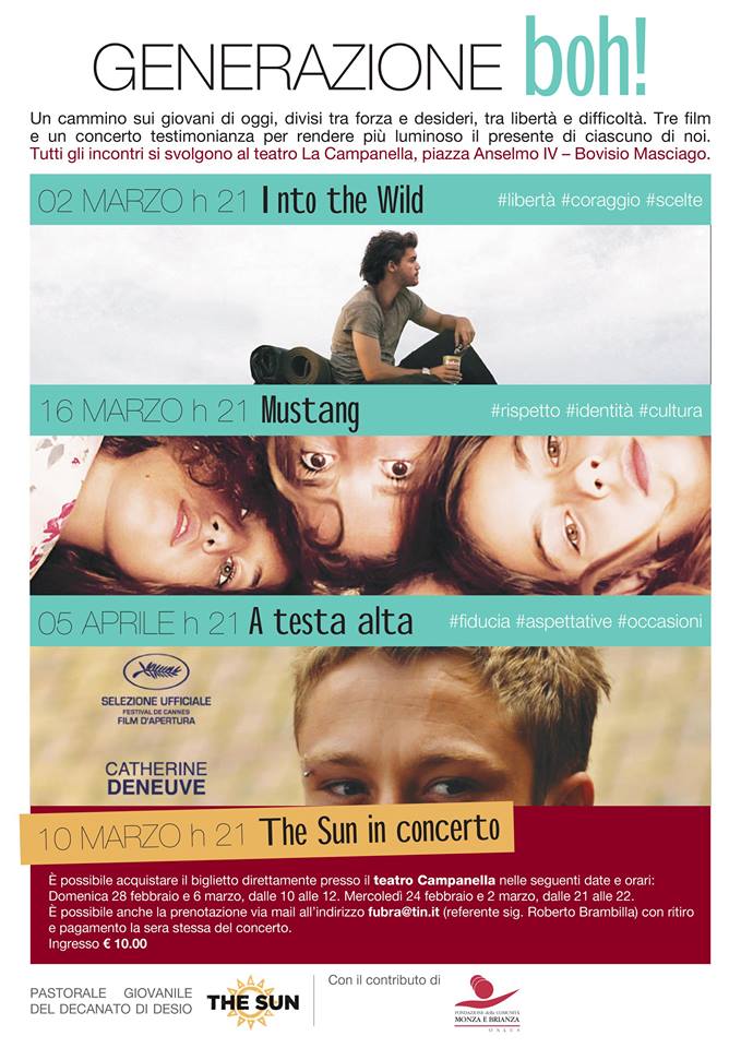 Il titolo nasce da una riflessione, ma è un invito a guardare oltre. Si chiama infatti “Generazione Boh!” il percorso promosso dalla Pastorale giovanile del Decanato di Desio, sostenuto dalla Fondazione della Comunità Monza e Brianza Onlus: un cammino sui giovani di oggi, divisi tra forza e desideri, tra libertà e difficoltà. In sostanza tre film e un concerto-testimonianza per rendere più luminoso il presente dei ragazzi.