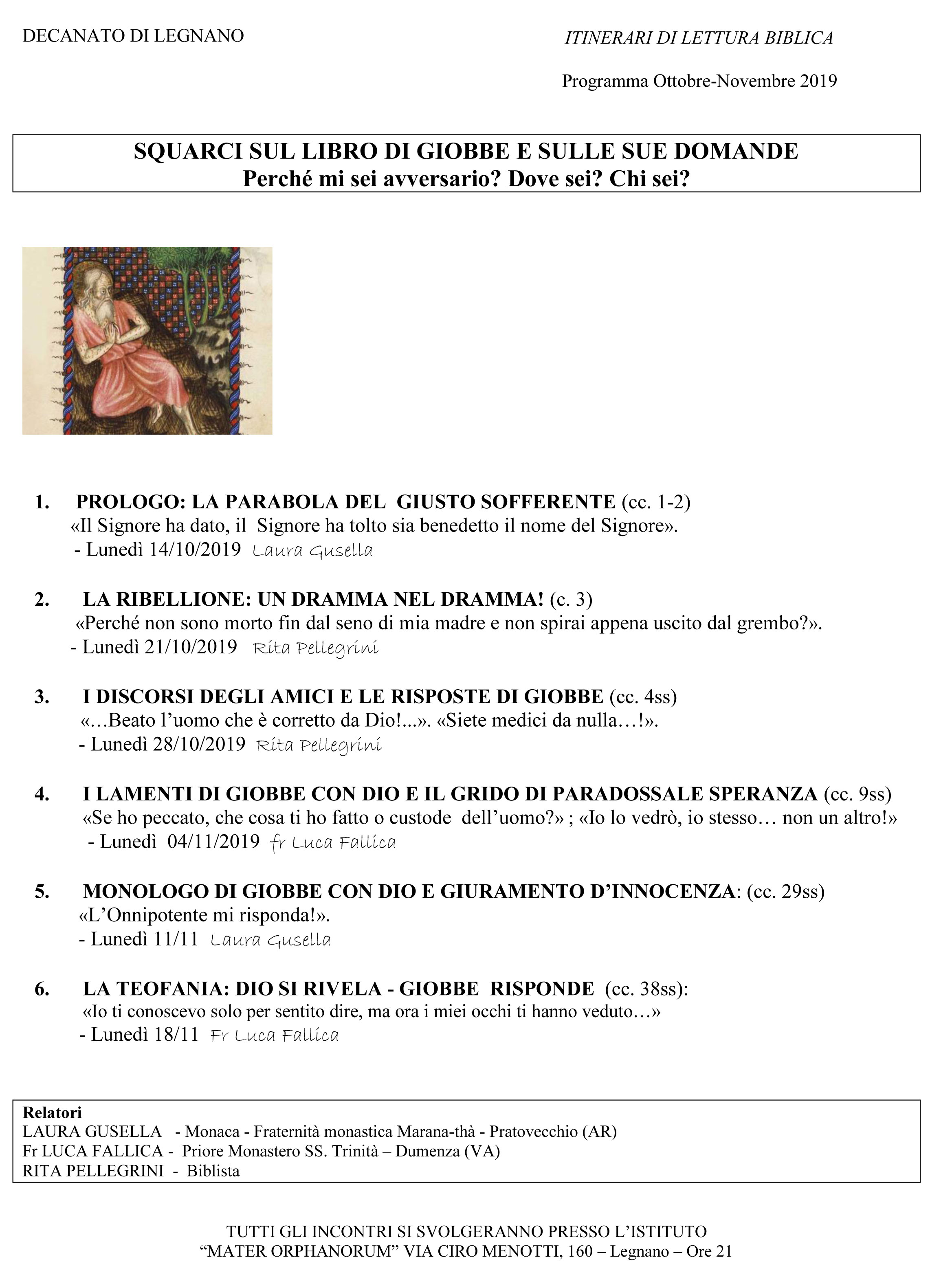 Il Decanato di Legnano propone un itinerario di lettura biblica dal titolo «Squarci sul libro di Giobbe e sulle sue domande: perché mi sei avversario? Dove sei? Chi sei?»; gli incontri