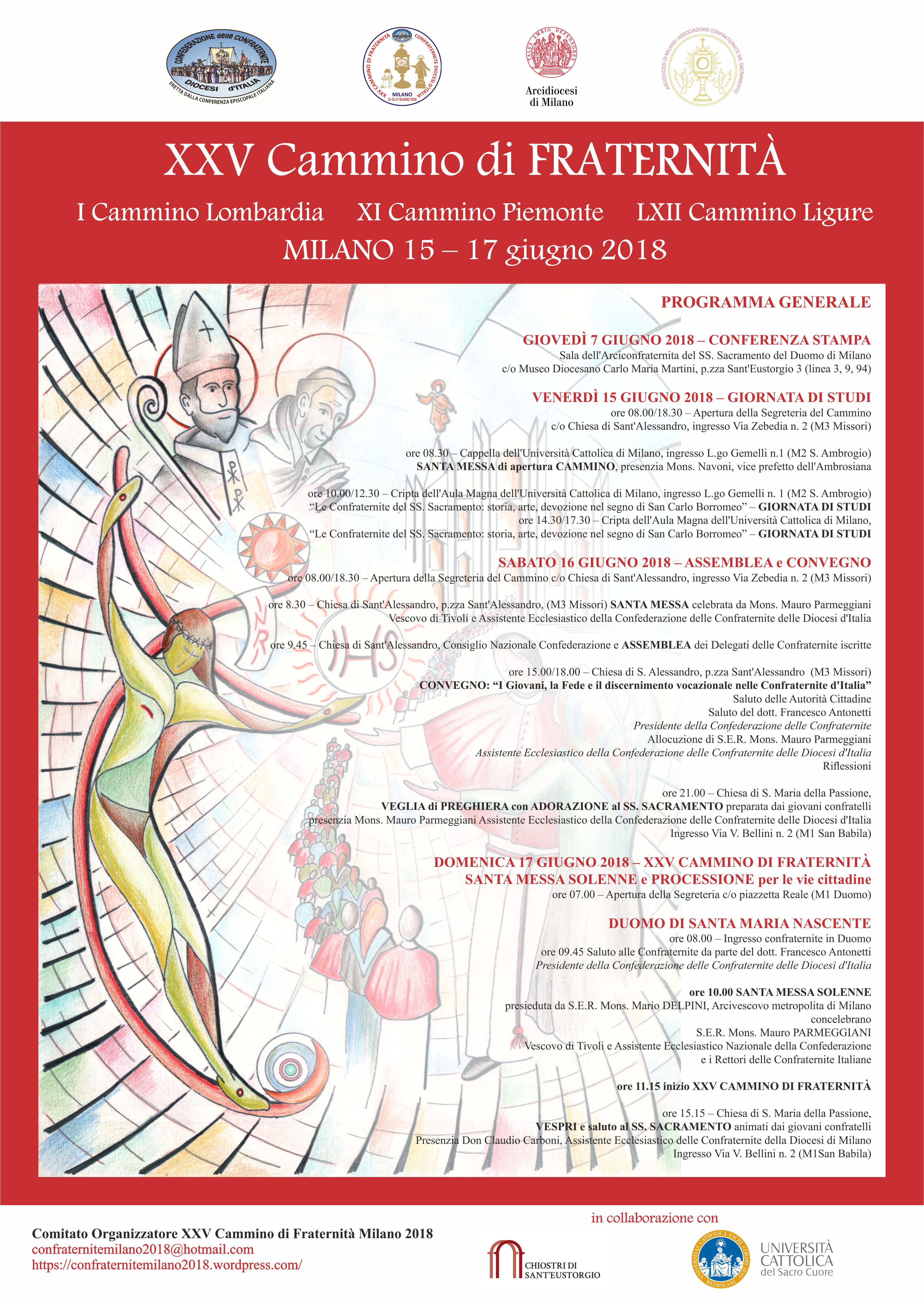 Dal 15 al 17 giugno si svolgerà a Milano il XXV Cammino delle Confraternite delle Diocesi d’Italia. Unitamente al I Cammino delle Confraternite della Regione Ecclesiastica Lombarda, al LXII Cammino della Regione Ecclesiastica Ligure e all’XI Cammino delle Confraternite Piemontesi. L’evento, organizzato dal Comitato “Cammino Nazionale Confraternite Milano 2018”, beneficia del sostegno dell’Associazione delle Confraternite del SS. Sacramento dell’Arcidiocesi di Milano e dell’Arcidiocesi ambrosiana e rappresenta il momento più intenso e pregnante delle attività della Confederazione della Confraternite delle Diocesi d’Italia.