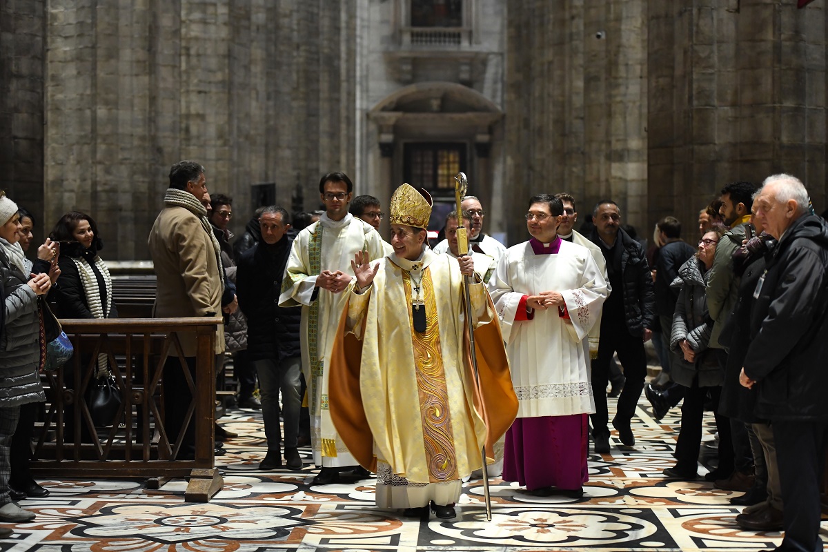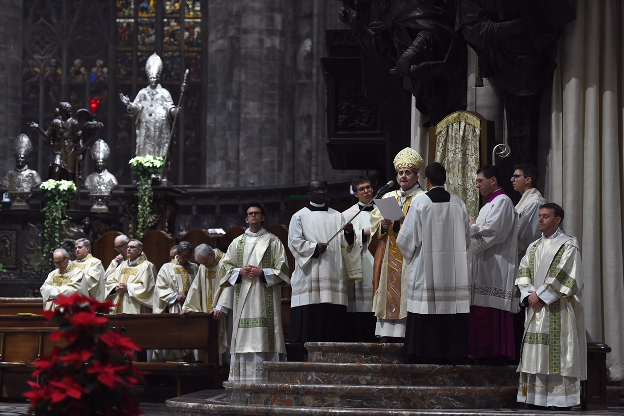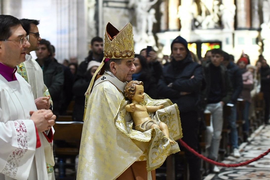 È la Celebrazione presieduta dall’Arcivescovo nella Notte di Natale, in cui tutto parla della nascita del Signore: la luce che inonda la Cattedrale, i moltissimi fedeli, la Parola di Dio, le Letture, tra le quali la tradizionale, ambrosiana, “Esposizione del Vangelo secondo Luca” di sant’Ambrogio, proclamata nella Veglia di preghiera che precede l’Eucaristia. Nella cui processione iniziale il vescovo Mario – accanto a lui concelebrano i Canonici del Capitolo metropolitano – porta tra le mani l’artistica raffigurazione lignea del Dio Bambino che depone nella “culla”, posta ai piedi dell’altare maggiore.