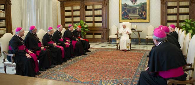 È sempre un incontro carico di emozione quello tra il Successore di Pietro e il gruppo di vescovi che ogni cinque anni si ritrovano per confrontarsi sulla situazione della rispettive Chiese. Ma in questo caso lo è stato ancor di più, perché il Papa è entrato nel cuore di tutti ed in particolare, dei vescovi e del popolo di Dio. Anche se velato dalla tristezza e dalla malinconia. Un incontro vissuto da tutti i presenti nell’orizzonte della fede. Questi i sentimenti con cui i dieci presuli delle diocesi di Bergamo, Brescia, Como, Crema, Cremona, Lodi, Mantova, Pavia e Vigevano e i tre ausiliari guidati dall’arcivescovo di Milano cardinale Angelo Scola hanno vissuto questa udienza ad limina, l’ultima in calendario prima della sede vacante stabilita dal Papa il giorno 28 febbraio. Tre intense giornate per i presuli della conferenza episcopale lombarda che hanno incontrato i capi dicastero delle congregazioni che compongono la curia romana insieme con i vescovi liguri culminata nell’udienza con il Santo Padre. Dopo la congregazione per il Clero e quella per la Dottrina della Fede e quella per l’Educazione Cattolica e gli Istituti di Vita Consacrata e per i Vescovi, l’atteso colloquio con il Santo Padre. L’udienza con il Papa è stata anche l’occasione per prendere in esame le positive ricadute del raduno mondiale delle famiglie svoltosi a Milano nel 2012, specie sulle diocesi lombarde. In particolare, le iniziative che a partire da questo appuntamento hanno trovato nuovo impulso nella pastorale familiare e nelle parrocchie sparse nell’ampio territorio.
