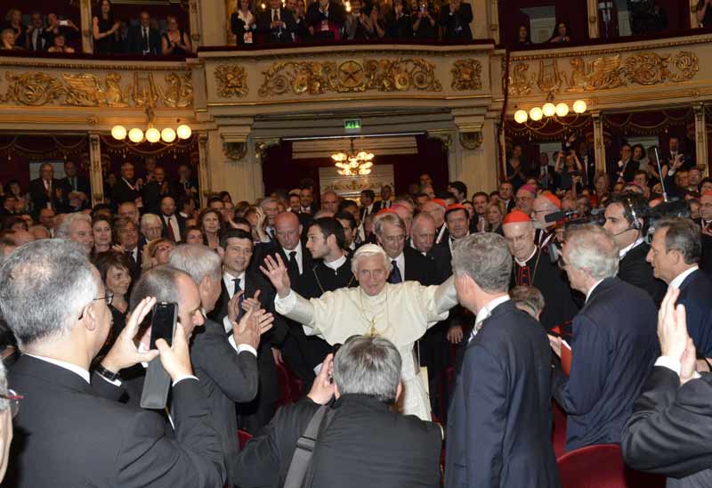 «La Nona Sinfonia di Beethoven ci permette di lanciare un messaggio con la musica che affermi il valore fondamentale della solidarietà, della fraternità e della pace», ha detto Benedetto XVI al termine del concerto, appuntamento a cui hanno partecipato anche i vescovi delle diocesi colpite dal sisma. «Su questo concerto, che doveva essere una festa gioiosa in occasione di questo incontro di persone provenienti da quasi tutte le nazioni del mondo – ha proseguito il Papa – vi è l’ombra del sisma che ha portato grande sofferenza su tanti abitanti del nostro Paese». Poi un riferimento preciso all’Inno alla Gioia: «Le parole riprese dall’Inno – ha spiegato Benedetto XVI – suonano come vuote per noi, anzi, sembrano non vere», perché siamo «paralizzati dal dolore per così tanta e incomprensibile distruzione che è costata vite umane, che ha tolto casa e dimora a tanti».
