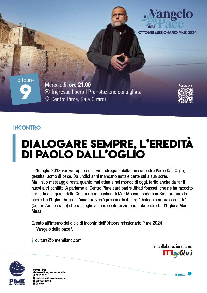 In questa occasione, che rientra nell’ambito del ciclo di incontri dell’Ottobre missionario Pime 2024 «Il Vangelo della pace», in collaborazione con Itl Libri e l’Ufficio missionario dell’Arcidiocesi di Milano, sarà presentato il libro Dialogo sempre con tutti (Centro Ambrosiano), il secondo volume (preceduto da Il mio testamento, 2023) dedicato alle conferenze finora inedite tenute da padre Dall’Oglio a Mar Musa. Un progetto importantissimo, che vuole continuare a dare risonanza all’instancabile impegno di padre Paolo nel promuovere la pace e il dialogo tra le diverse fedi, un valore che oggi appare più che mai indispensabile.
