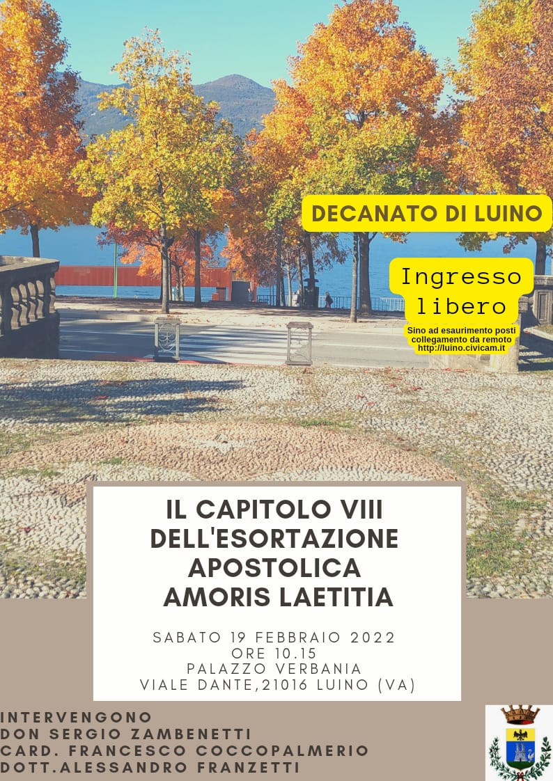 Sabato 19 febbraio, alle 10.15, presso la sala conferenze di Palazzo Verbania in viale Dante a Luino (Varese), si terrà un incontro pubblico dal titolo «Il capitolo VIII dell’esortazione apostolica Amoris Laetitia» organizzato dal locale Decanato (vedi qui la locandina). Relatori il cardinale Francesco Coccopalmerio (presidente emerito del Pontificio Consiglio dei Testi Legislativi), don Sergio Zambenetti (prevosto e decano di Luino) e Alessandro Franzetti (dottore di ricerca in Diritto e Scienze umane ed ex presidente del Consiglio comunale di Luino).