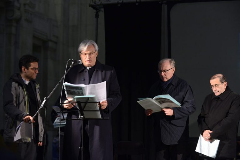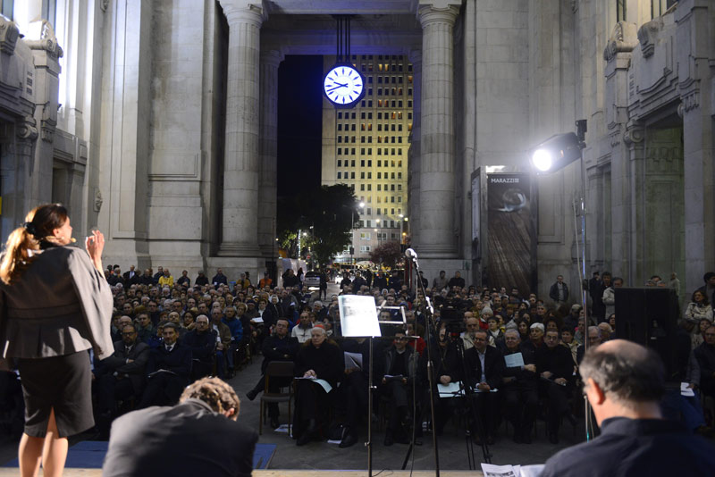 La stazione è un microcosmo che non si ferma neanche per la veglia. Mentre sul palco allestito per l’occasione si alternano testimonianze e preghiera, appena pochi metri più in là gli schermi pubblicitari continuano a lampeggiare, promuovendo incessanti vestiti e telefonini. I treni partono e arrivano, i rumori nitidi che si sentono dall’assemblea testimoniano che diverse persone stanno lavorando anche a tarda sera per permettere ai passeggeri di raggiungere le loro destinazioni. Decine di turisti, o pendolari, quasi tutti con un trolley al seguito, sfilano guardando incuriositi il palco che ospita il cardinale Angelo Scola. Qualcuno si ferma pure per qualche minuto, prima di affrettarsi nuovamente in direzione dei binari.