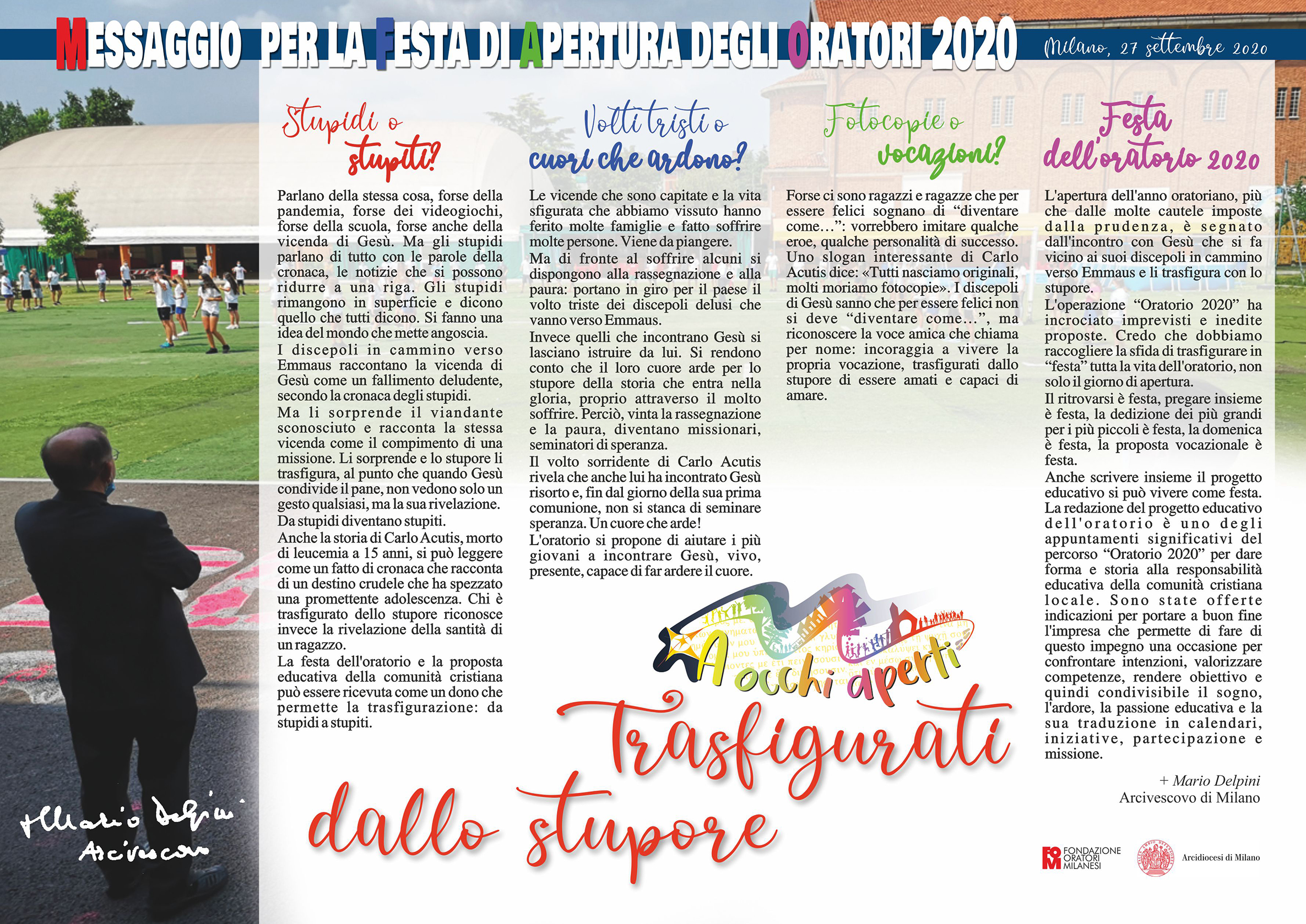 L’operazione “Oratorio 2020” ha incrociato imprevisti e inedite proposte. Credo che dobbiamo raccogliere la sfida di trasfigurare in “festa” tutta la vita dell’oratorio, non solo il giorno di apertura.