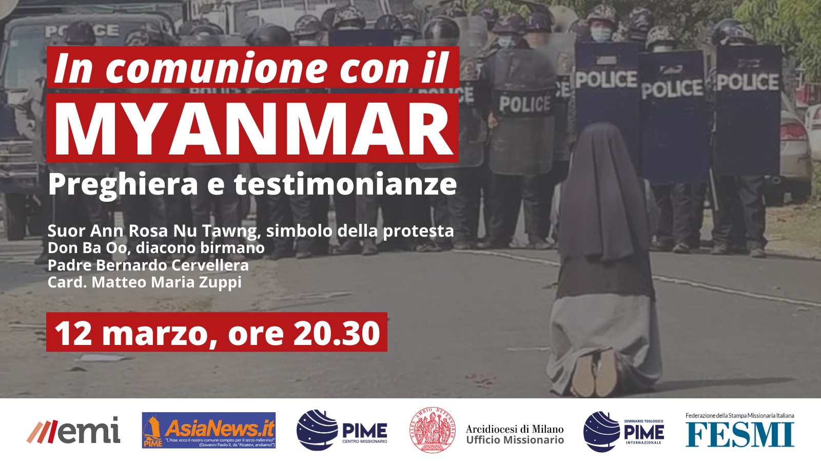 Venerdì 12 marzo, alle 20.30, una serata di ascolto, preghiera e testimonianze sulla difficile situazione del Myanmar, dove la Chiesa è in prima linea nella difesa della democrazia e dei diritti umani, è promossa da Emi – Editrice Missionaria Italiana, insieme all’Ufficio Missionario dell’Arcidiocesi di Milano, AsiaNews, Centro Missionario e Seminario teologico internazionale Pime e Federazione della Stampa Missionaria Italiana – Fesmi.