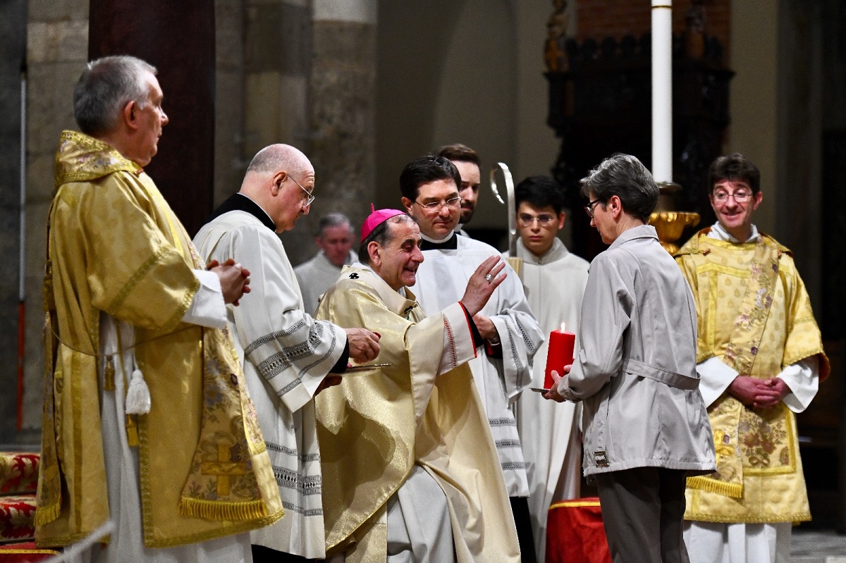 Tra parenti e amici, colleghi di lavoro, la Comunità giunta da Treviso, i già assistenti spirituali, don Gianni Colzani e don Paolo Cortesi e attuale, don Antonio Torresin – in prima fila, tra le navate, siedono la “sorella maggiore”, Susanna Poggioni e il Consiglio direttivo composto da 4 consorelle che la coadiuvano nella guida dell’Istituto -, l’Eucaristia si fa segno visibile e culmine di tante iniziative promosse per un intero anno come segno di festa e di ringraziamento per una presenza bella e feconda, già intuita e formulata dall’oggi san Giovanni Battista Montini che le Ausiliarie considerano il loto vero fondatore.