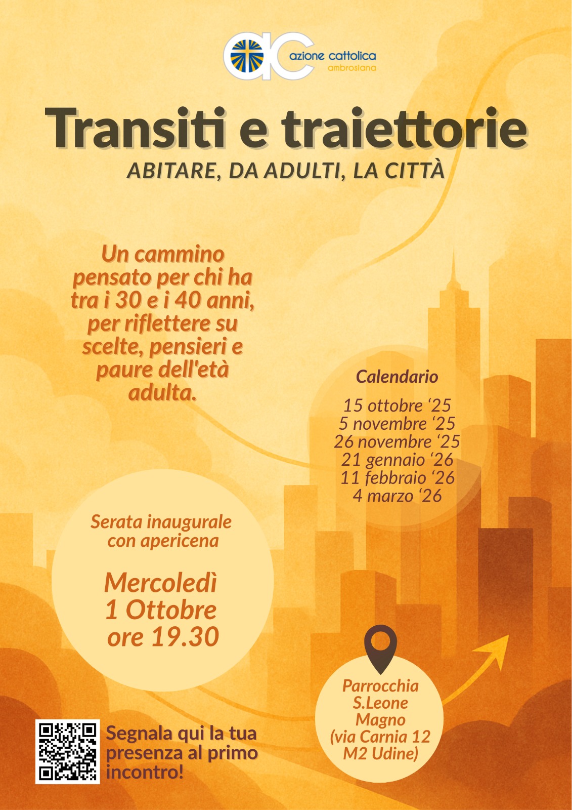Come sede del percorso, che non è rivolto solo ai soci dell’Azione cattolica, ma a chiunque sia interessato, è stata chiesta ospitalità alla parrocchia milanese di San Leone Magno, comodissima dalla fermata Mm2 Udine, dalla Stazione Fs di Lambrate e dalla Tangenziale Est e quindi facilmente accessibile sia dalla città, sia dall’hinterland. «Il primo appuntamento sarà in forma molto conviviale con un aperitivo e ci permetterà di conoscere l’intero percorso», assicurano gli organizzatori.