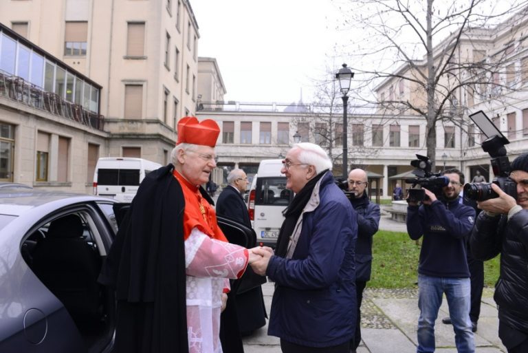 «Camminando con lei, Eminenza, tra i nostri ospiti abbiamo attraversato la frontiere del dolore e della vita, facendo una fleboclisi di ottimismo non manieristico e un overdose di speranza». Dice così – senza mezzi termini – il presidente della Fondazione Don Carlo Gnocchi, monsignor Angelo Bazzari, che a conclusione della vista del Cardinale all’Istituto Palazzolo, rivolge all’Arcivescovo un ringraziamento a nome dell’intera direzione e del personale. «Questa, all’esordio e alla fine della vita, è la nostra compagnia fatta dei bimbi della neuropsichiatria infantile, dei malati di SLA e di coloro che sono negli stati vegetativi, di chi soffre di Parkinson e della malattia di Alzheimer», continua Bazzari mentre Scola ascolta attento e prende molti appunti. «È la frontiera che ci ha lasciato don Gnocchi quando nella tragica ritirata di Russia ha immaginato e sognato la sua opera che oggi è tutto questo. Cerchiamo di rispondere a gravi bisogni, nella fede, con grandi e profonde motivazioni».