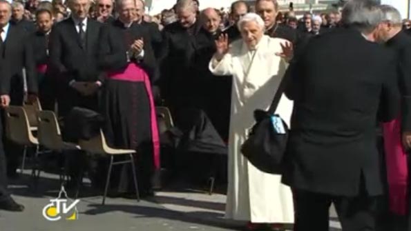 «Siamo nell’Anno della fede, che ho voluto per rafforzare proprio la nostra fede in Dio in un contesto che sembra metterlo sempre più in secondo piano. Vorrei invitare tutti a rinnovare la ferma fiducia nel Signore, ad affidarci come bambini nelle braccia di Dio, certi che quelle braccia ci sostengono sempre e sono ciò che ci permette di camminare ogni giorno anche nella fatica». Queste le parole con le quali oggi Benedetto XVI, nel penultimo giorno del suo pontificato e nella sua ultima udienza generale del mercoledì, si è rivolto alle centinaia di migliaia di fedeli riuniti per salutarlo in piazza San Pietro.