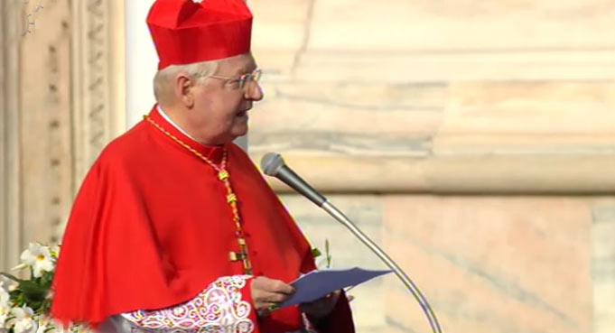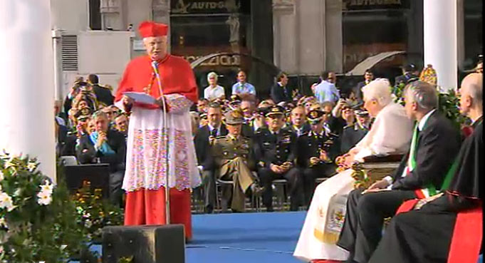 Dopo il saluto del sindaco, il cardinale Angelo Scola ha rivolto al Santo Padre il suo benvenuto: «Con commozione e con gioia in questa piazza, cuore pulsante della nostra città e dell’area metropolitana milanese, divenute ormai cosmopolite, La accogliamo oggi, Successore di Pietro giunto a confermare la nostra fede»: questo l’esordio dell’Arcivescovo.