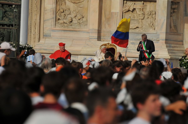 Poi Benedetto XVI ha rivolto il suo saluto ai milanesi. La città ha saputo «coniugare sapientemente – ha osservato il Papa – l’orgoglio per la propria identità con la capacità di accogliere ogni contributo positivo che, nel corso della storia, le veniva offerto. Ancora oggi, Milano è chiamata a riscoprire questo suo ruolo positivo, foriero di sviluppo e di pace per tutta l’Italia». Nel suo discorso il Papa ha voluto rivolgere un saluto particolare ai rappresentanti delle famiglie provenienti da tutto il mondo che partecipano al VII Incontro Mondiale, e il saluto è stato ricambiato da un intenso applauso della piazza.