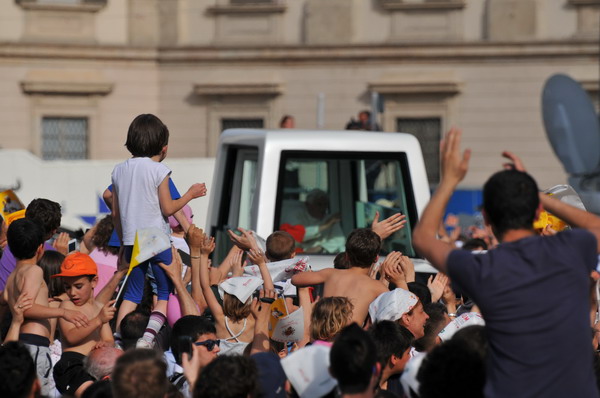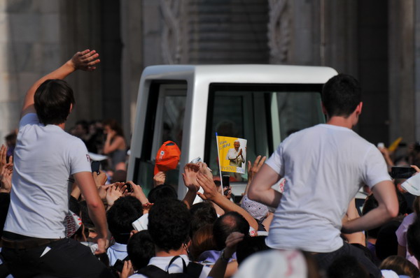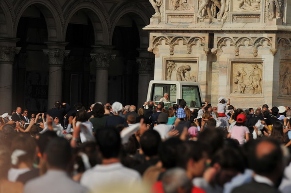 Il Santo Padre è arrivato poco prima delle 18, ha fatto il giro della piazza sulla Papamobile per salutare i fedeli, poi è salito sul palco. «Sono molto lieto di essere oggi in mezzo a voi – ha detto – e ringrazio Dio che mi offre l’opportunità di visitare la vostra illustre Città. Il mio primo incontro con i Milanesi avviene in questa Piazza del Duomo, cuore di Milano, dove sorge l’imponente monumento simbolo della città. Con la sua selva di guglie esso invita a guardare in alto, a Dio. Proprio tale slancio verso il cielo ha sempre caratterizzato Milano e le ha permesso nel tempo di rispondere con frutto alla sua vocazione: essere un crocevia – Mediolanum – di popoli e culture».