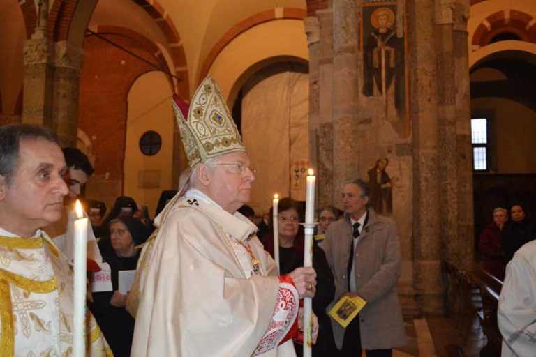 Prima di giungere all’altare e di iniziare la celebrazione eucaristica, l’Arcivescovo e alcuni religiosi hanno svolto la tradizionale processione che ogni anno caratterizza la giornata della vita consacrata: hanno detto una preghiera nella cripta della basilica e poi hanno raggiunto la piccola cappella situata sulla navata destra della chiesa che accoglie le spoglie di Santa Marcellina, sorella di Ambrogio, vergine consacrata ed esempio per tutte le donne che hanno fatto la sua stessa scelta di vita.