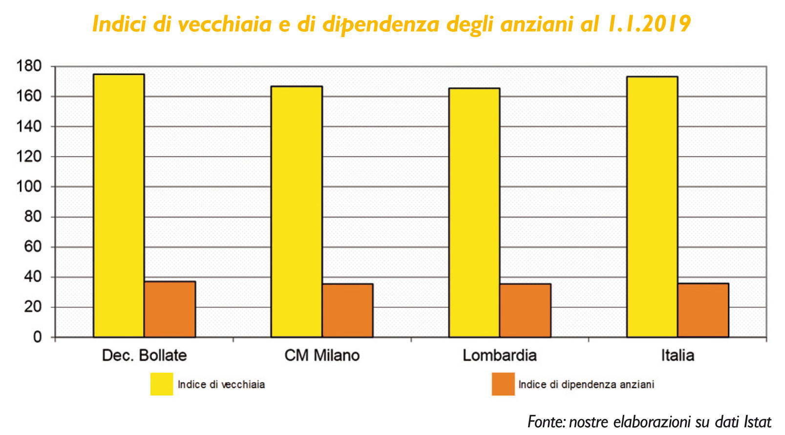 Tornando ad analizzare la popolazione nel suo complesso e nelle proprie ripartizioni demografiche, è interessante notare che i minorenni (under 18 anni) rappresentano il 16,4% del totale dei residenti nel Decanato al 1° gennaio 2019, e cioè lievemente di più rispetto al 16,3% d’incidenza media entro la città metropolitana di Milano. Contemporaneamente gli ultrasessantacinquenni rappresentano il 23,4% (e il 25,6% tra le femmine) e cioè nettamente di più rispetto alle quote invece comprese tra il 22,6% e il 22,8% che caratterizzano la città metropolitana di Milano, la Regione e l’intera Italia. Cosicché gli indici di vecchiaia e di dipendenza anziani registrano valori elevati e peggiori rispetto alle medie di tali aree territoriali. Per esempio: l’indice di vecchiaia sfiora i 175 punti (mentre in particolare mediamente in Regione è poco sopra i 165), indicando la presenza di circa sette anziani ultrasessantacinquenni ogni quattro giovani minori di 15 anni; dal canto suo, l’indice di dipendenza degli anziani (che indica il rapporto tra la popolazione ultrasessantacinquenne e la popolazione in età attiva tra i 15 e i 64 anni, estremi d’età inclusi) raggiunge i 37 punti, mentre altrove mediamente nella città metropolitana, in Regione ed in Italia oscilla piuttosto attorno ai 35 e mezzo.