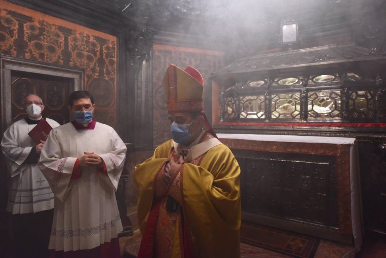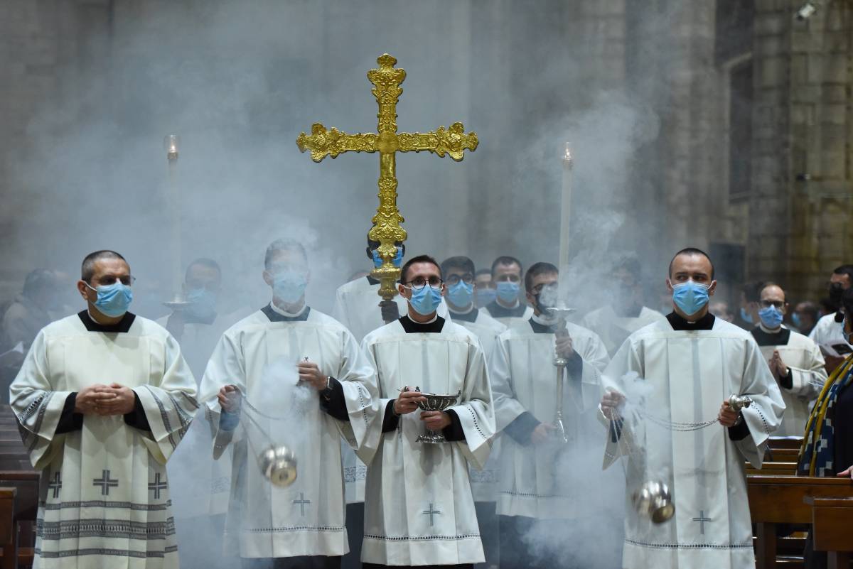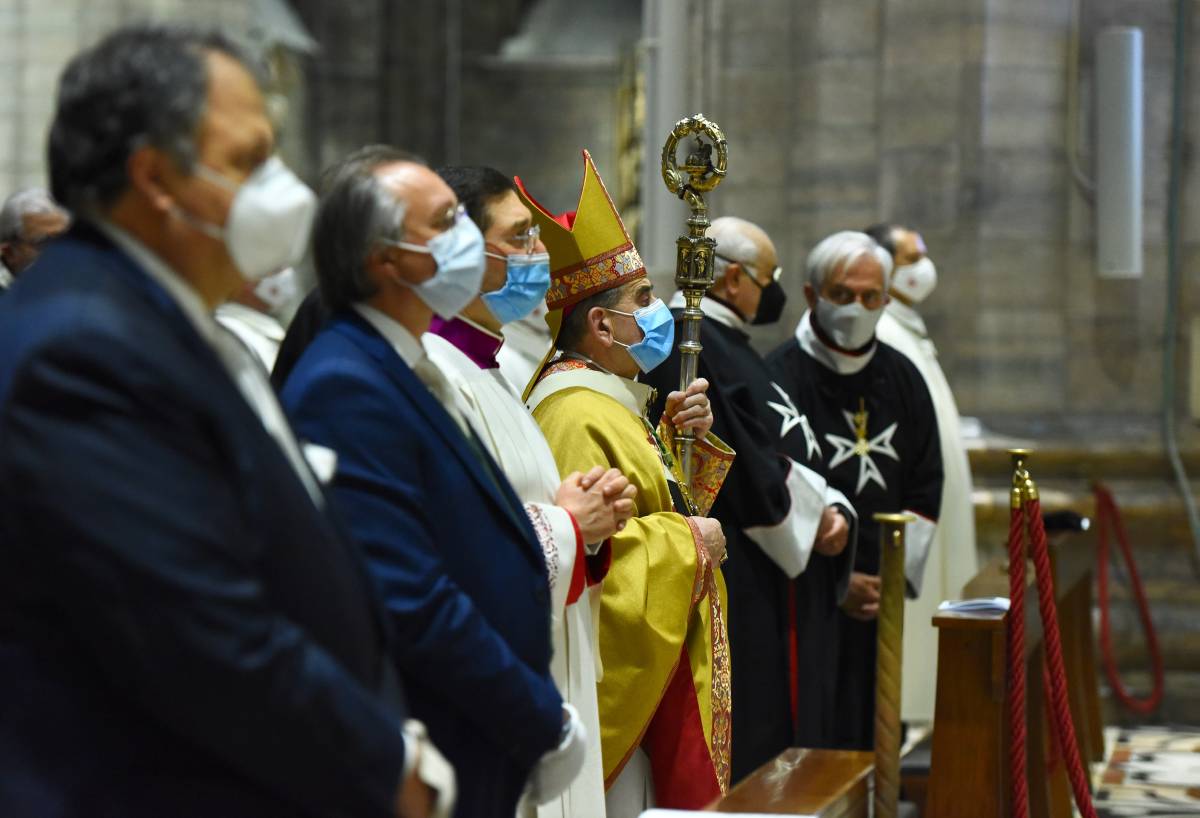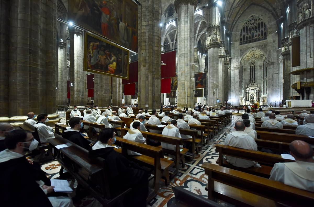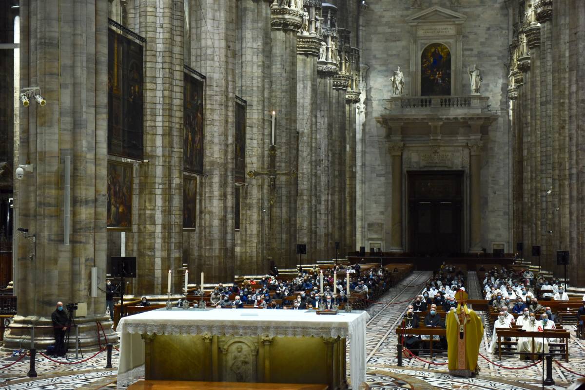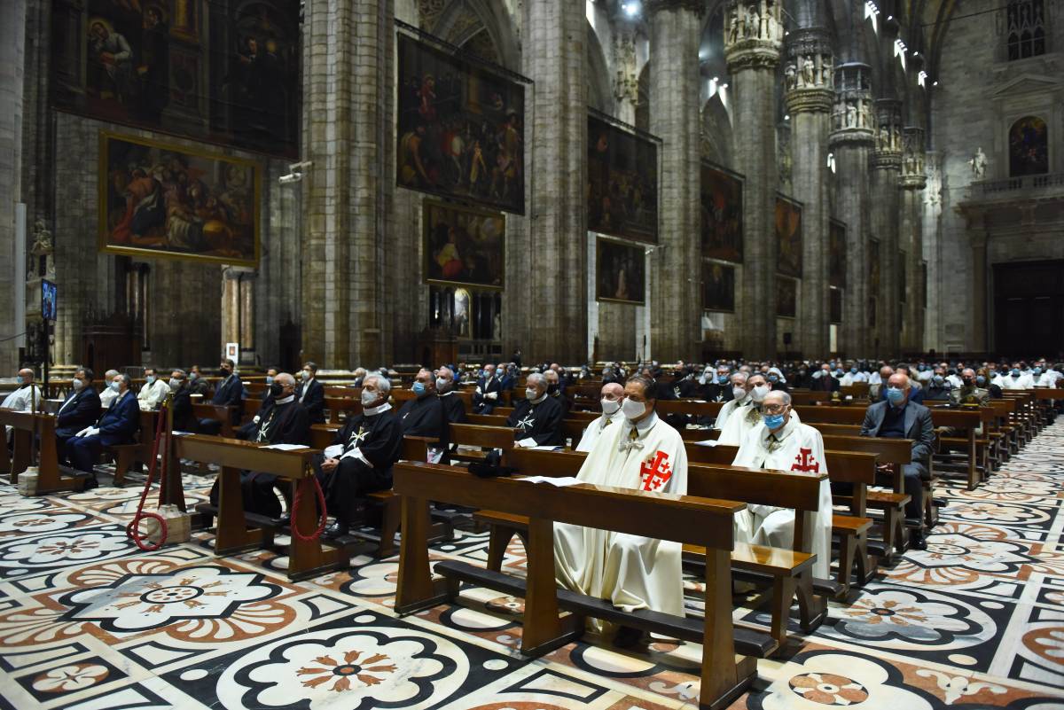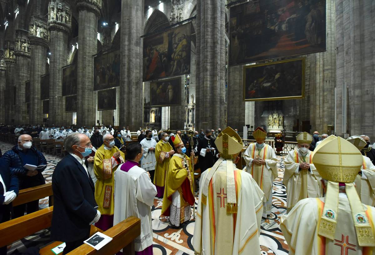 Così, presso lo “Scurolo” che conserva le spoglie del santo Vescovo, attorno a monsignor Delpini per la preghiera che precede la Messa, ci sono 10 altri vescovi – tra cui monsignor Stanislav Hocevar, arcivescovo di Belgrado e monsignor Adelio Dell’Oro, prete ambrosiano, vescovo di Karaganda in Kazakhstan – e coloro che queste Istituzioni rappresentano: il rettore del Seminario, don Enrico Castagna, il prevosto degli Oblati di San Carlo, padre Giulio Binaghi, il moderator Curiae, monsignor Bruno Marinoni, l’arciprete del Duomo, monsignor Gianantonio Borgonovo. Concelebranti, unitamente ai membri del Consiglio Episcopale Milanese, ai canonici del Capitolo metropolitano, agli Oblati diocesani, ai Decani (che nella giornata hanno partecipato alla loro periodica assemblea) e a molti sacerdoti. Presenti molti fedeli, i seminaristi, i Diaconi transeunti e permanenti, i fratelli Oblati di San Carlo, i rappresentati delle Confraternite e degli Ordini cavallereschi.