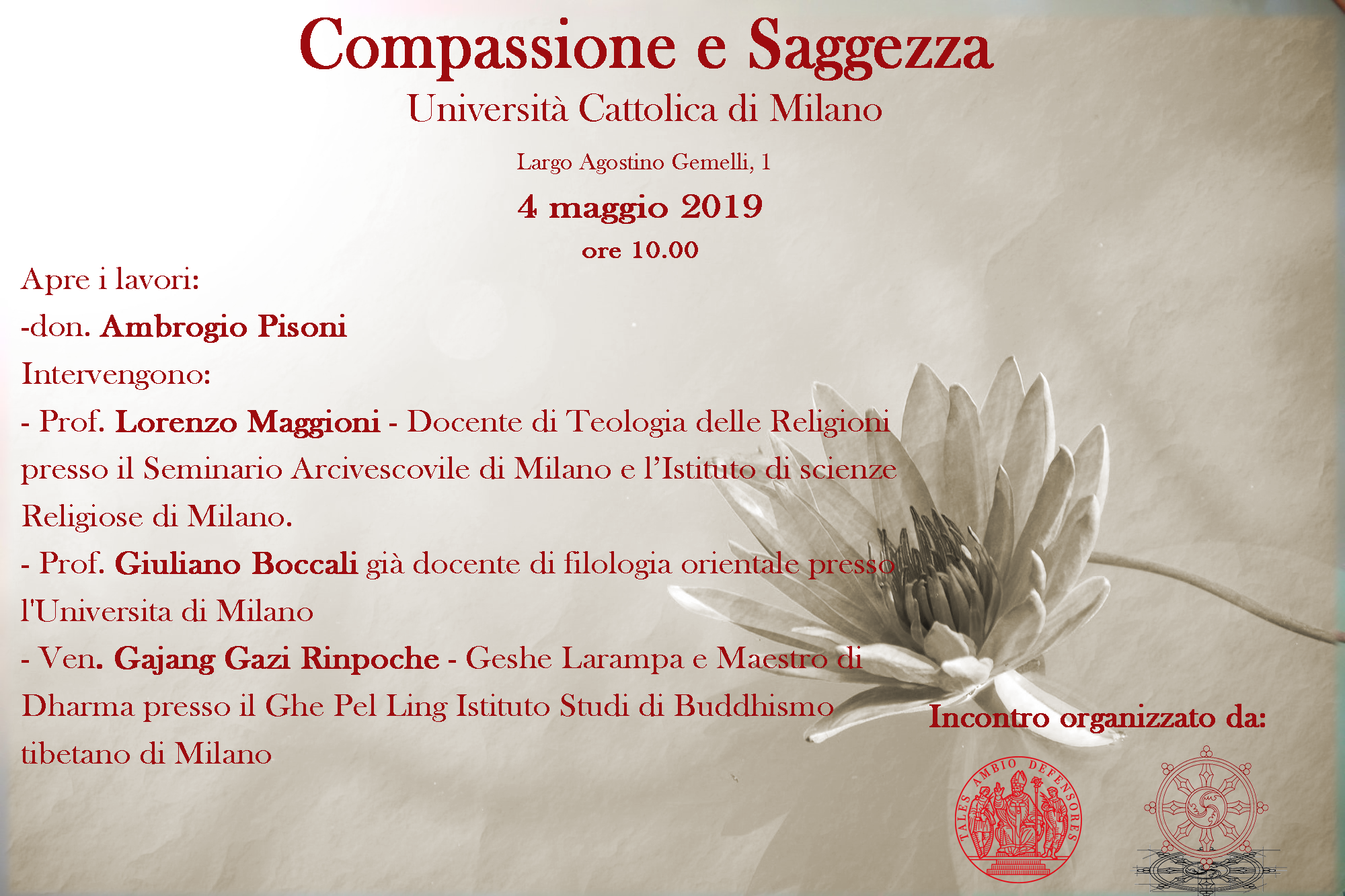 Interverranno poi il professor Lorenzo Maggioni (docente di Teologia delle religioni al Seminario Arcivescovile di Milano e all’Istituto di Scienze religiose di Milano), il professor Giuliano Boccali (già docente di Filologia orientale presso l’Università di Milano) e il Venerabile Gajang Gazi Rinpoche (Geshe Larampa e Maestro di Dharma presso il Ghe Pel Ling Istituto Studi di Buddhismo tibetano di Milano).