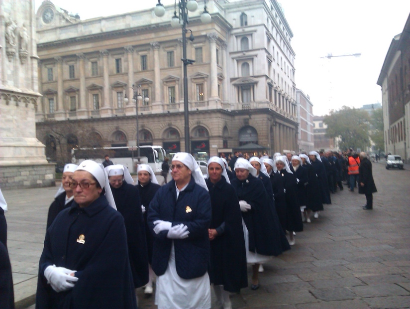 Negli anni questa organizzazione ecclesiale si è adeguata ai cambiamenti tecnici e logistici, ma senza mai deflettere dall’obiettivo di fede che si rivolge soprattutto a Lourdes. Per questo sta mattina la peregrinazione in terra lombarda delle reliquie di Santa Bernadette è giunta a Milano, dopo aver attraversato le sedi dell’Unitalsi (Unione nazionale italiana trasporto ammalati a Lourdes e santuari internazionali). Prima di iniziare la celebrazione in cattedrale, si è svolta sul sagrato una lunga processione che ha portato i resti sacri di Bernadette sull’altare del duomo; era composta da: i volontari, chiamati “sorelle” e “barellieri”, delle 23 sottosezioni lombarde dell’Unitalsi, dalla protezione civile, dagli operatori sanitari e dalla compagnia del colore, che si occupa dei bambini.